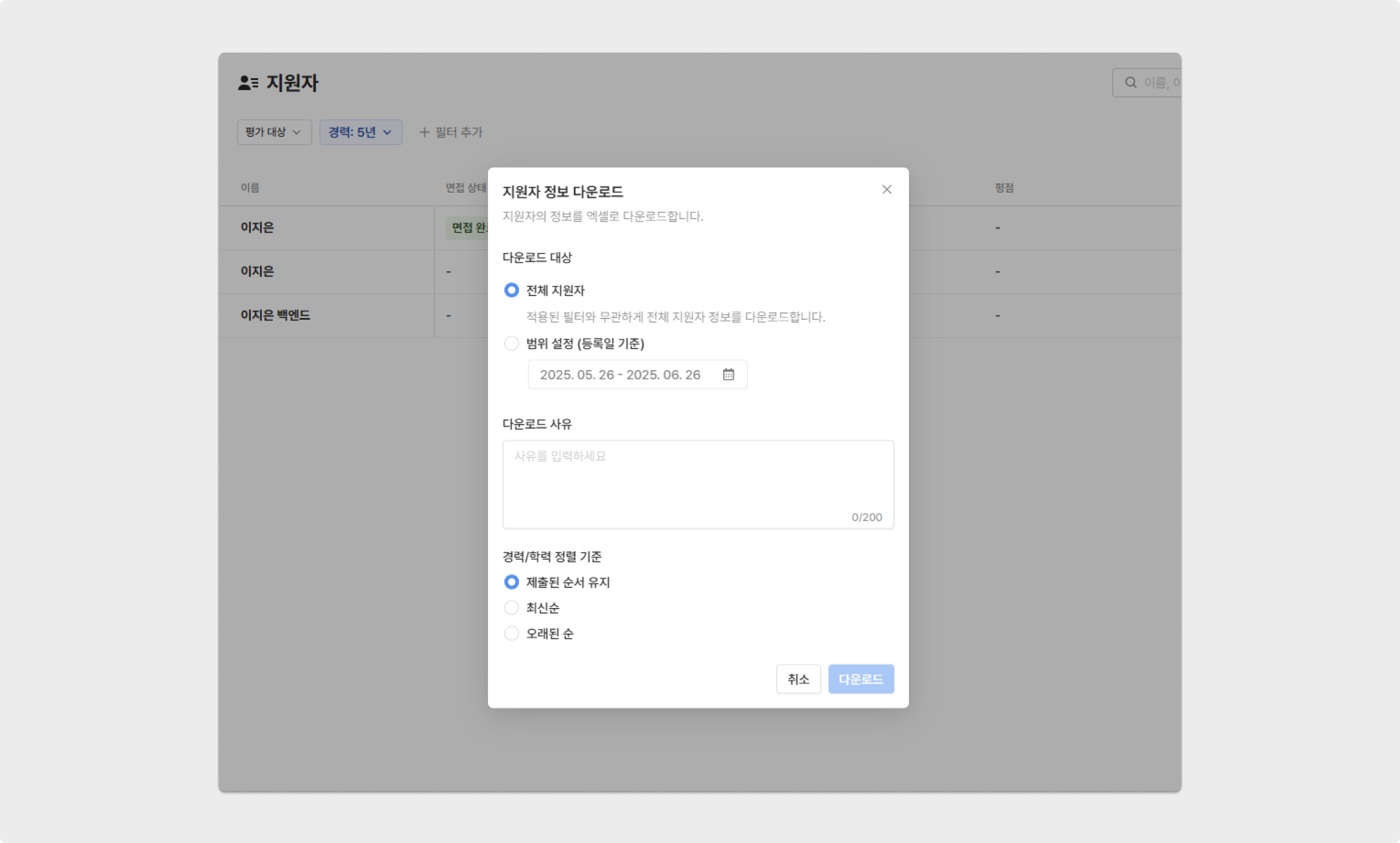 이때, 전체 기간의 지원자 데이터를 다운로드하거나, 특정 범위를 설정해 다운로드할 수도 있습니다.