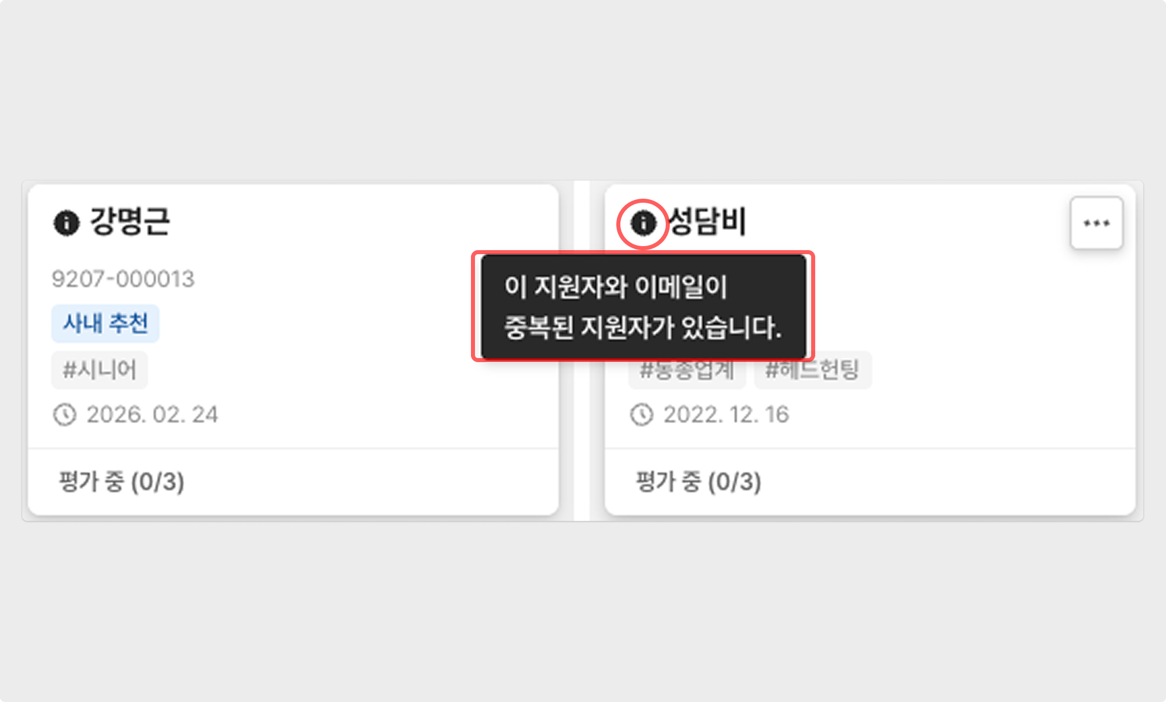 별도의 추가 설정 없이 이메일과 전화번호 중 하나의 중복 조건에 해당하면, 지원자 카드 내에 별도로 표현됩니다. 또한, 칸반 보드 형식/표 형식의 지원자 리스트 화면에서 모두 확인 가능합니다.