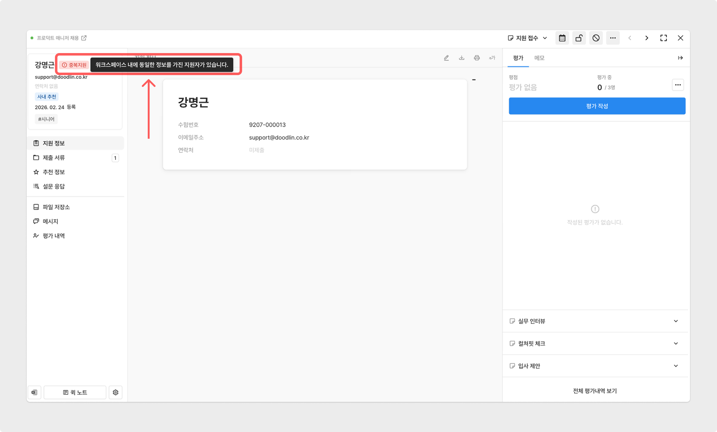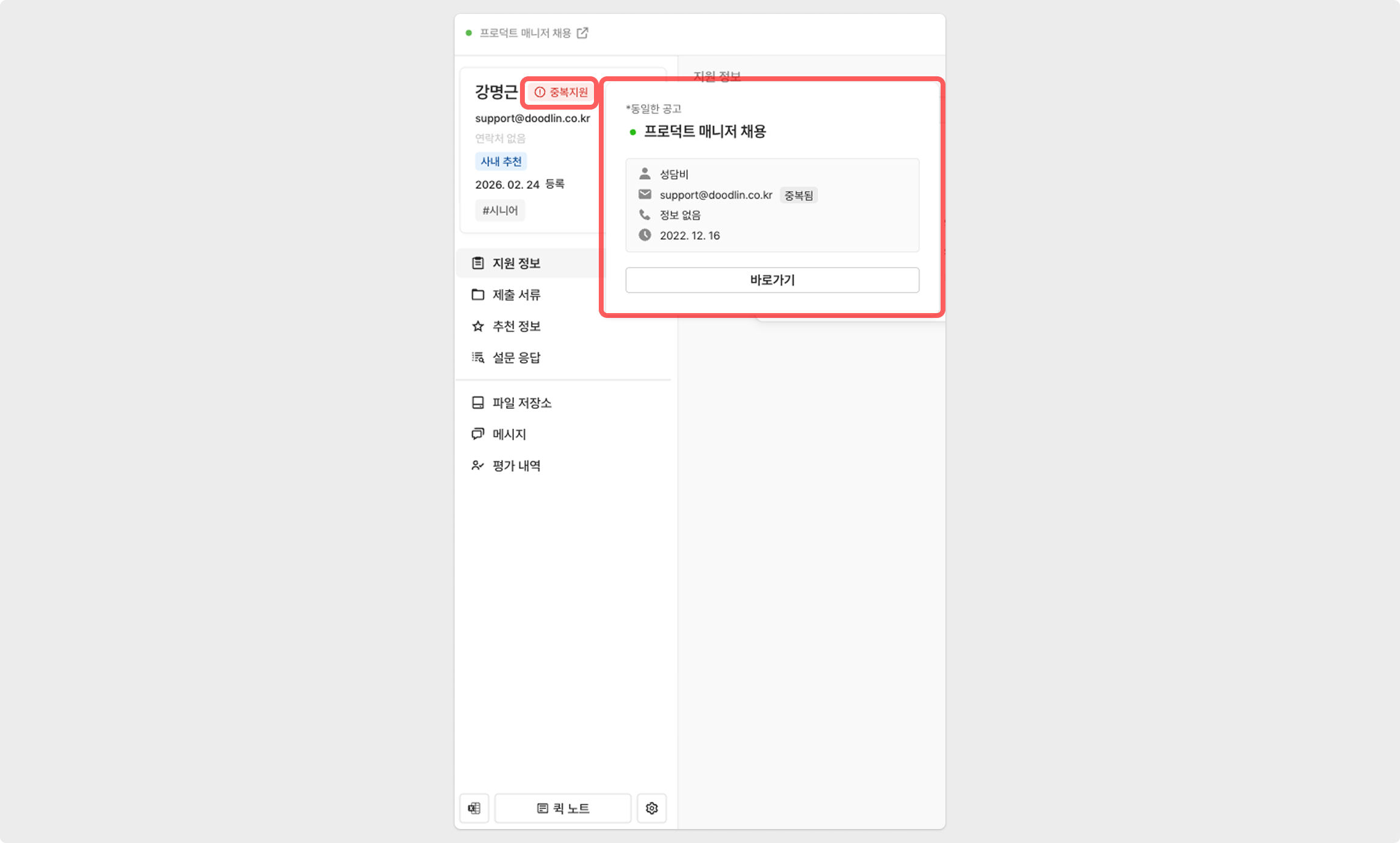 지원자 상세 페이지에서도 동일하게 확인 가능하며, 좌측 상단의 중복지원 버튼을 클릭하면 그 히스토리를 확인할 수 있습니다.