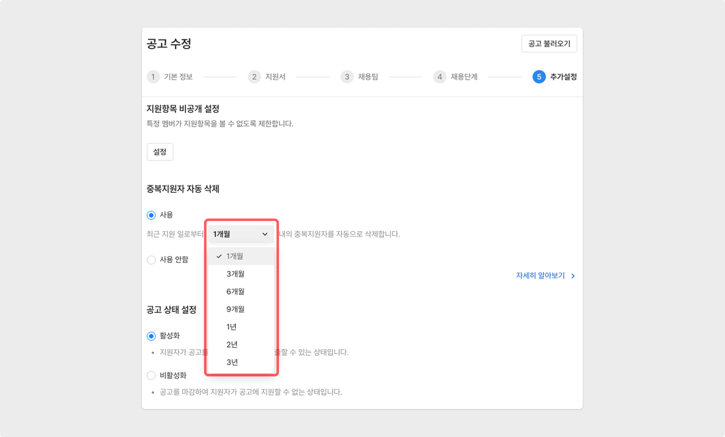 공고를 생성 혹은 수정하는 과정에서 기간을 설정하여 해당 기간 내의 중복지원자를 자동으로 삭제할 수 있습니다. 이 때, 중복지원자 자동삭제 기능은 동일한 공고내에서만 해당하며, 타 공고의 중복지원은 자동으로 삭제하지 않습니다.