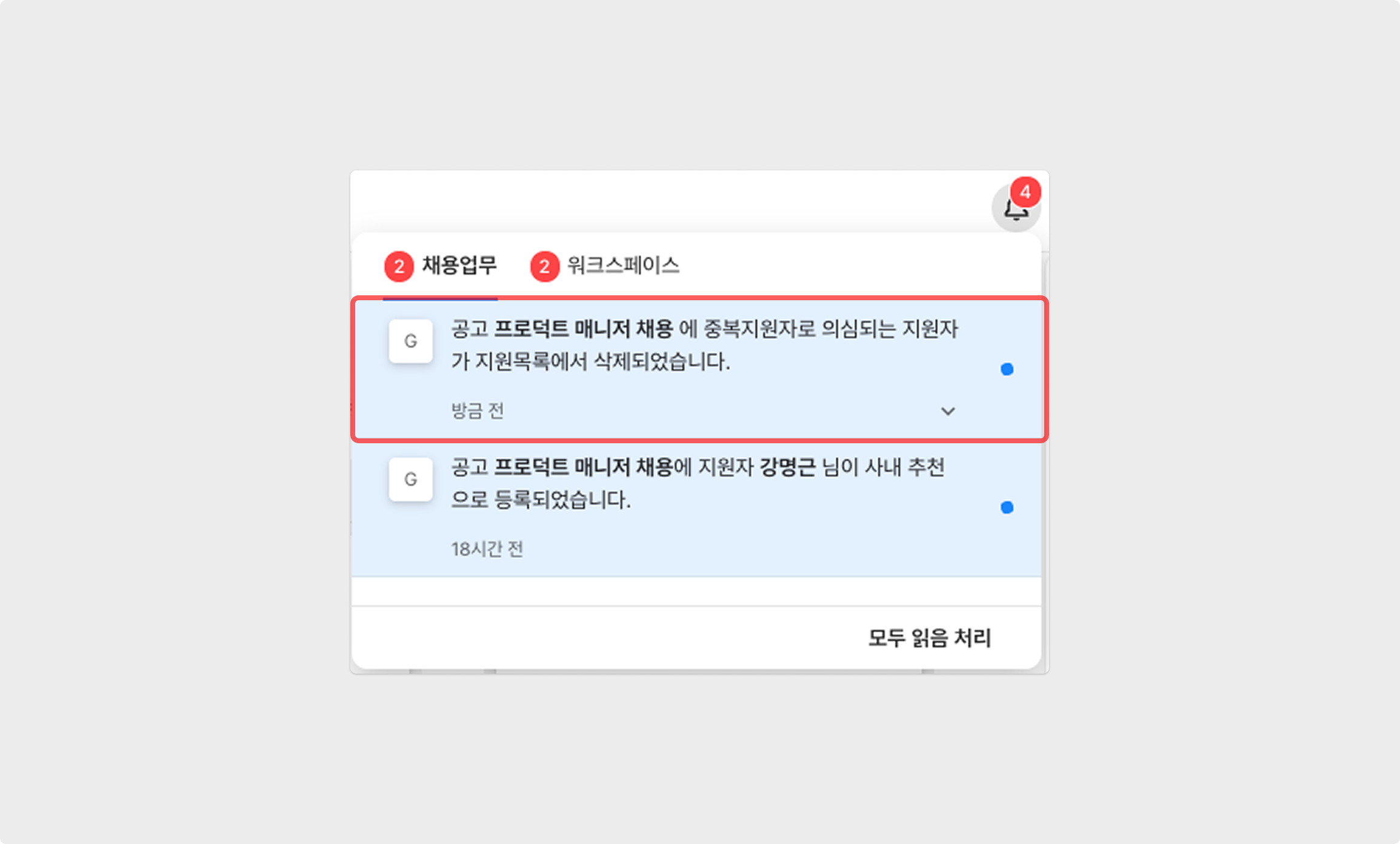 또한, 중복지원자가 삭제될 때마다 공고 참여 멤버에게 알림이 발송되어 누락을 방지할 수 있습니다.