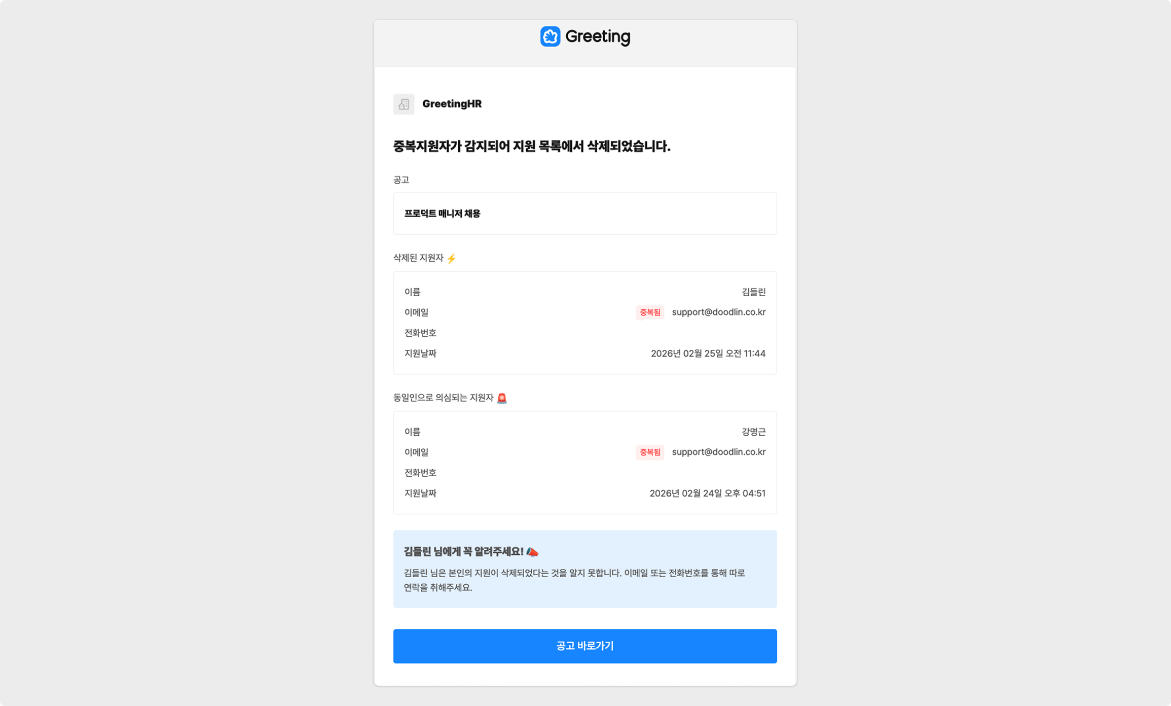 중복지원자 자동삭제 알림