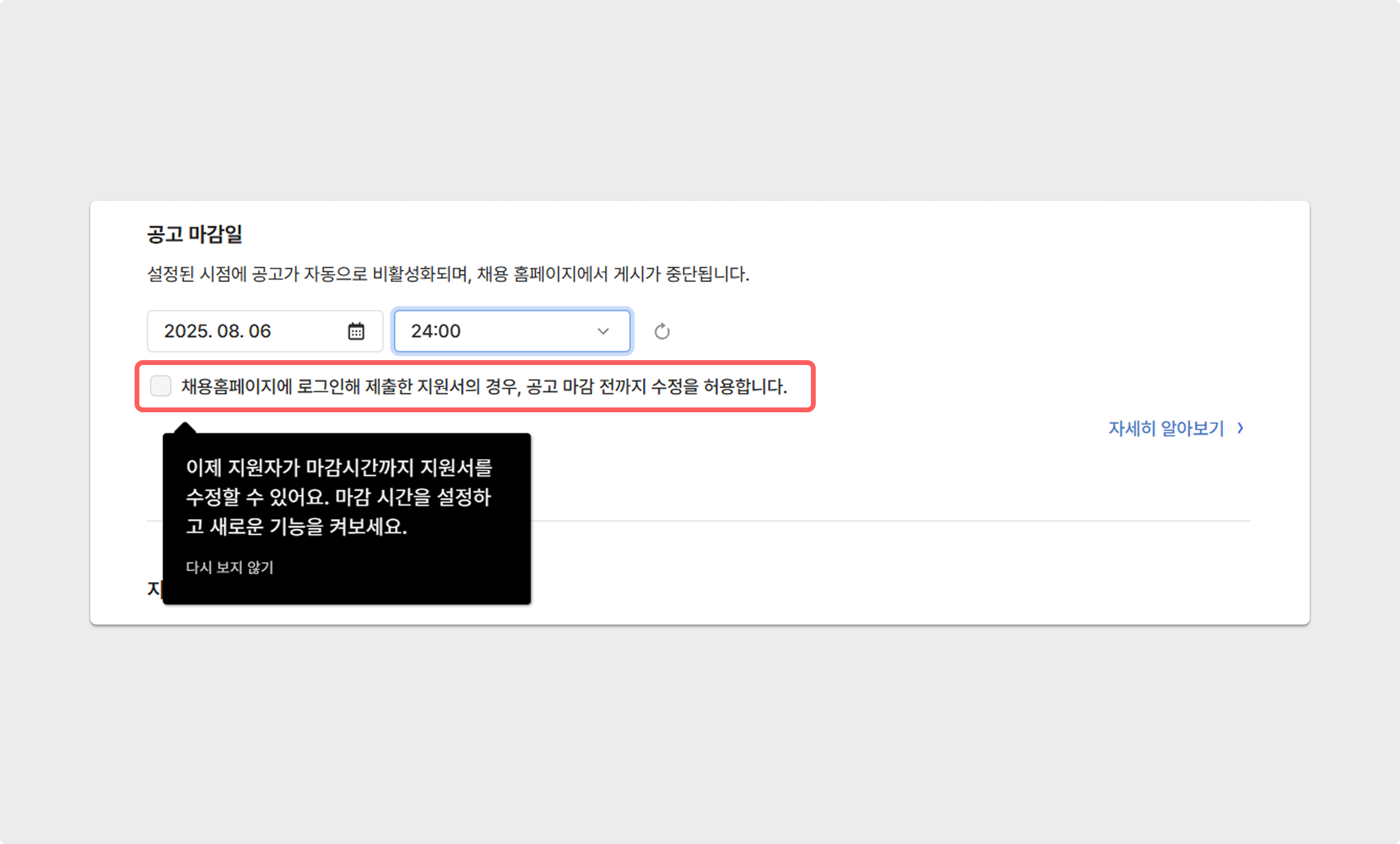 혼선을 방지하기 위해 지원자가 직접 지원서를 수정 제출할 수 있는 기능은 공고의 마감기한이 설정된 경우에만 설정할 수 있습니다.