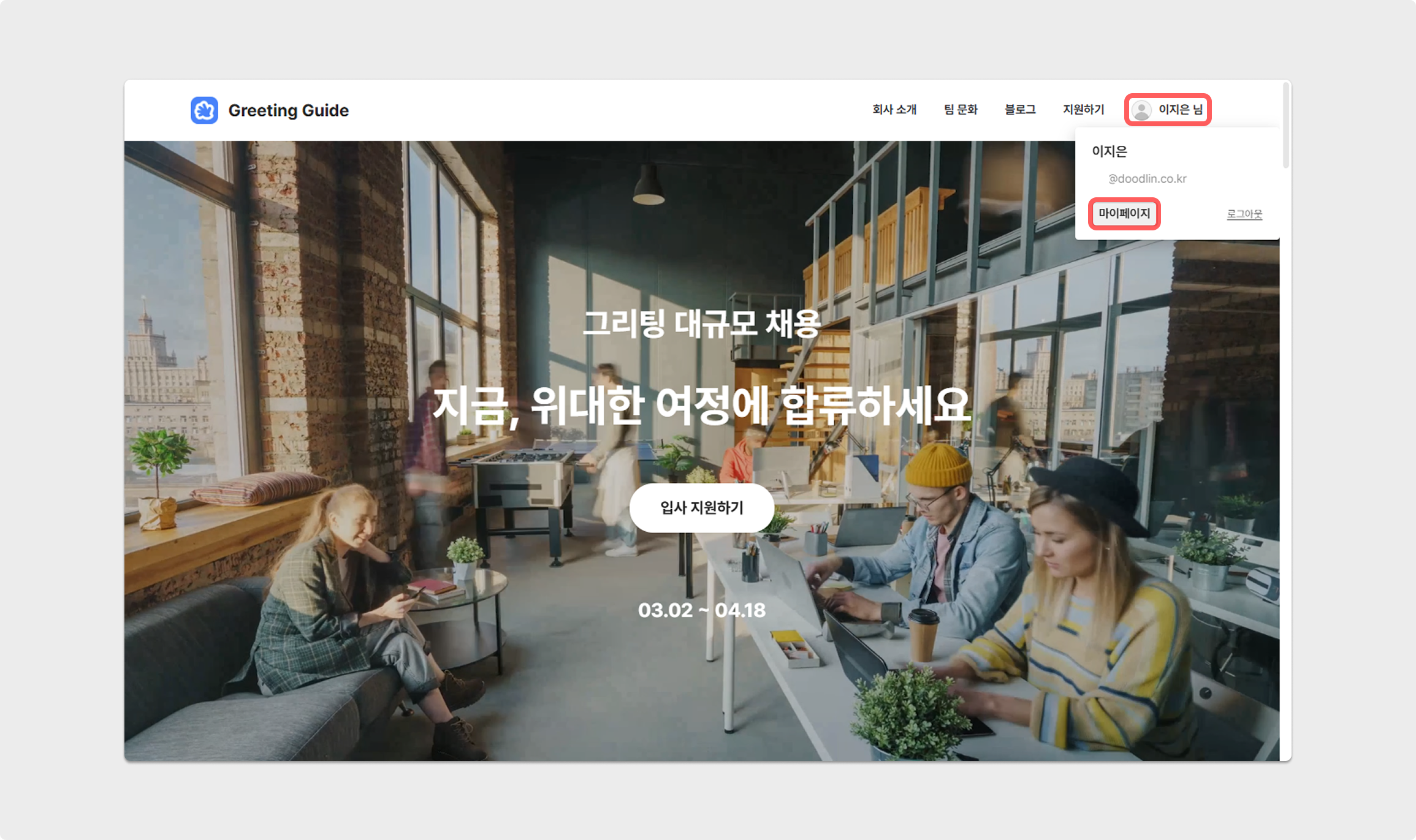 그리팅 채용 홈페이지 접속 - 마이페이지