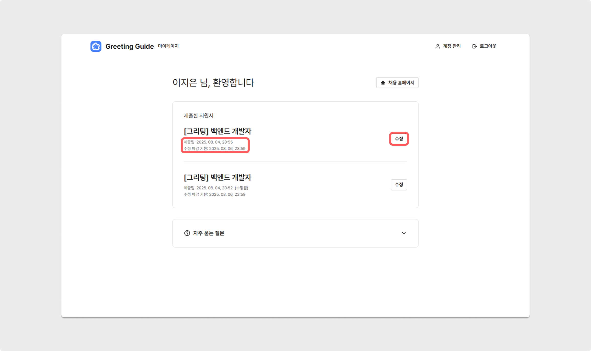그리팅 채용 홈페이지 지원자 로그인 → 마이페이지 → 제출한 지원서 → 수정