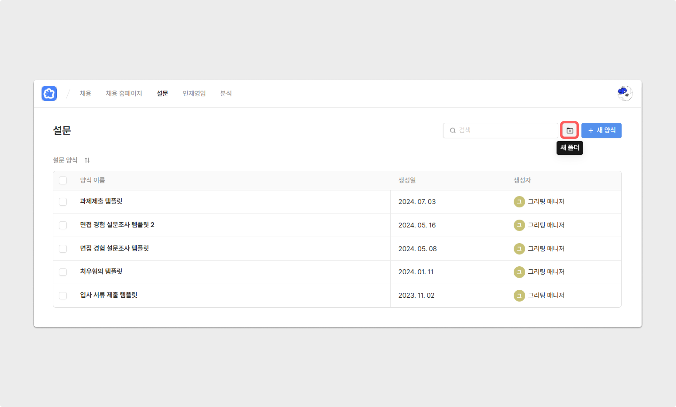 설문 페이지 내 우측의 아이콘을 클릭하여 새 폴더를 만들 수 있습니다.