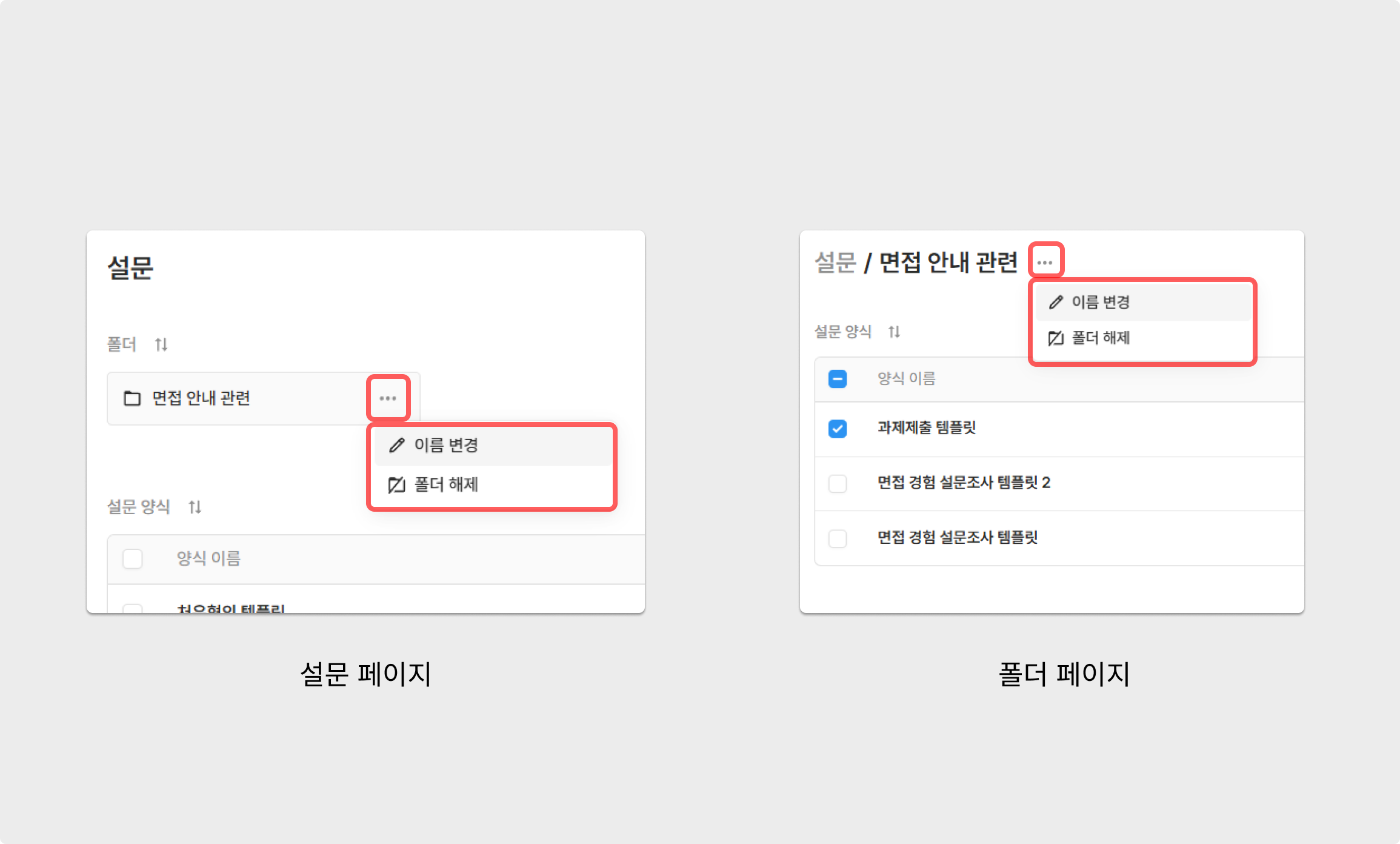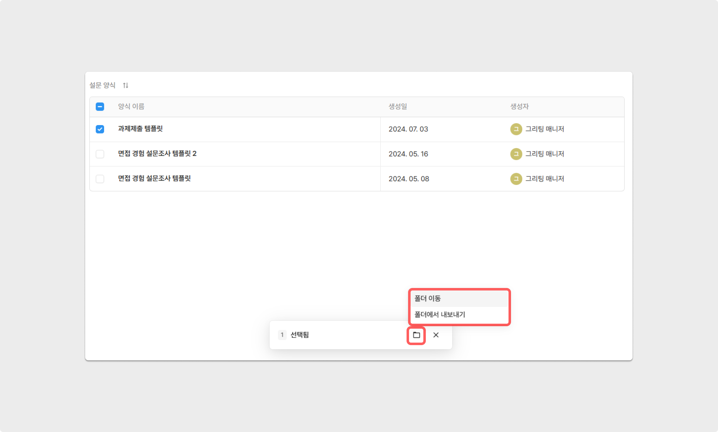 폴더에서 설문을 선택하여, 다른 폴더로 이동하거나, 내보내기를 진행할 수 있습니다.