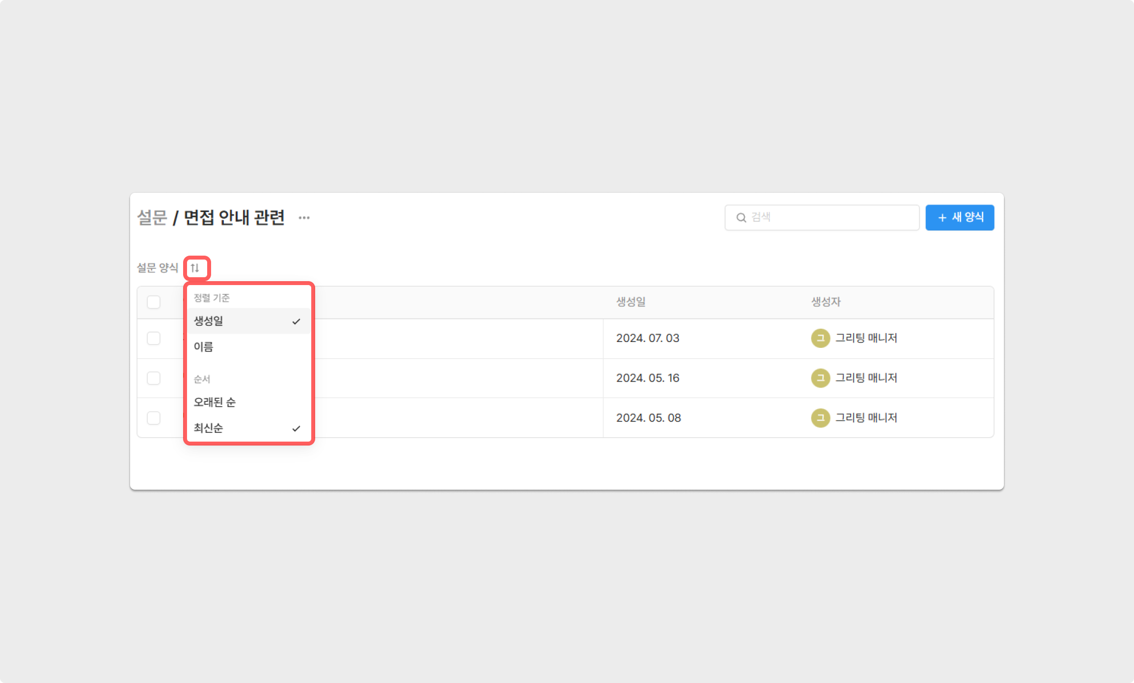 좌측 상단의 정렬 아이콘을 클릭하여, 각 기준으로 정렬 기준을 설정할 수 있습니다.