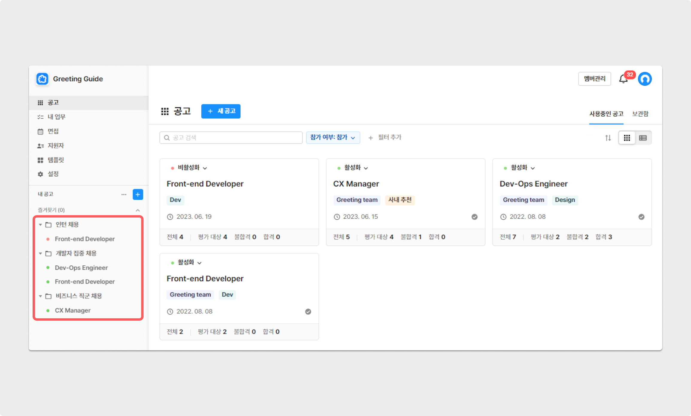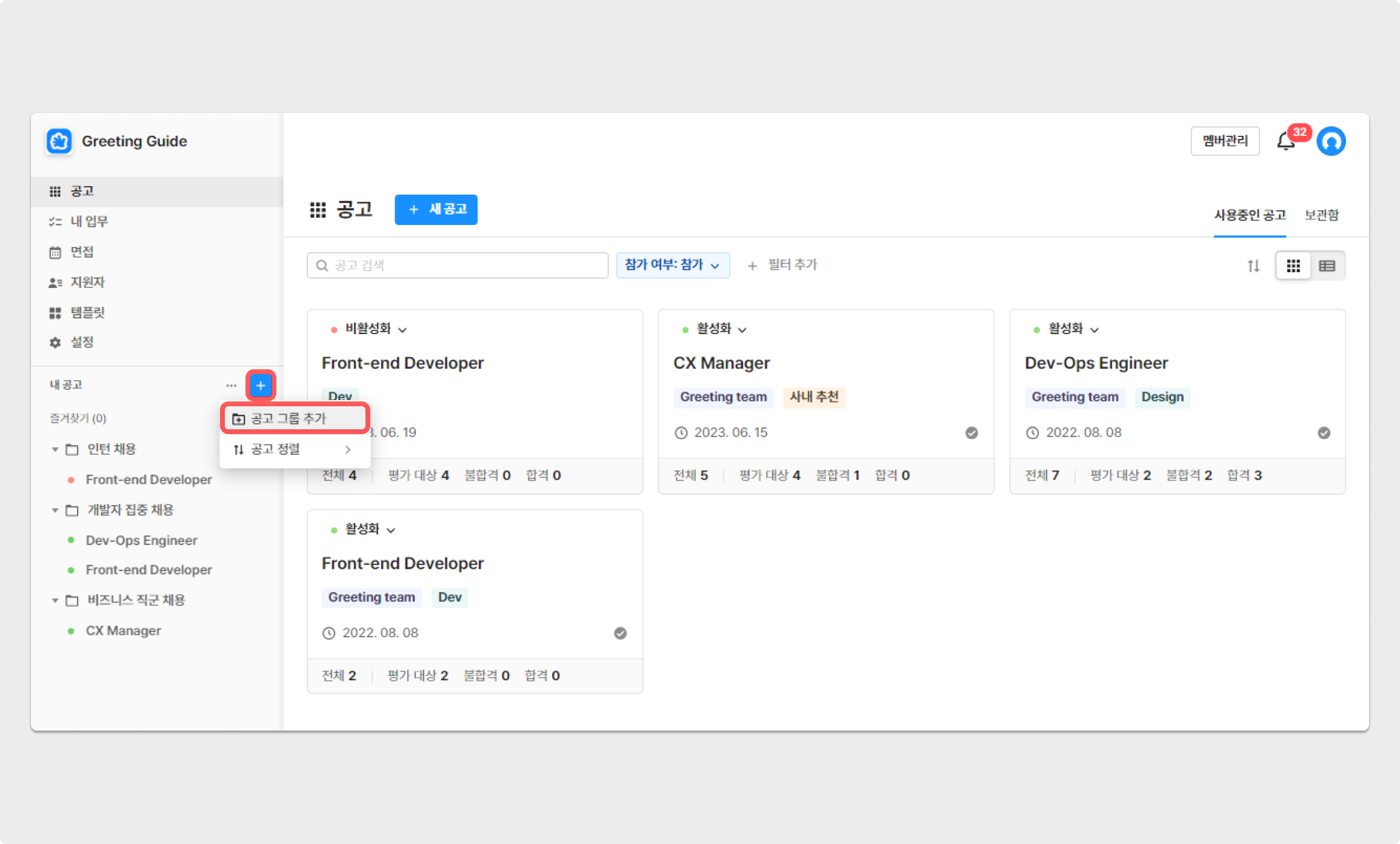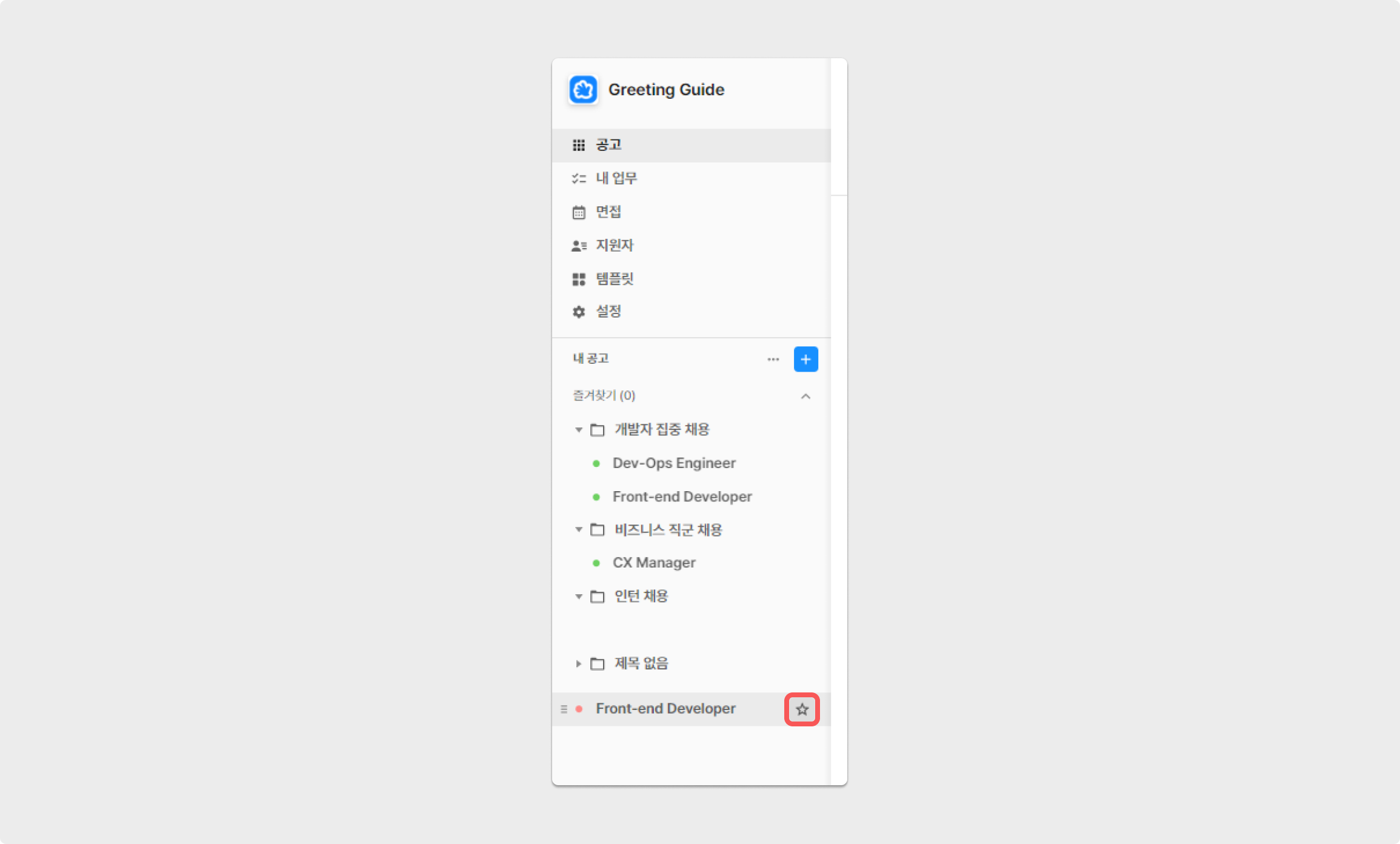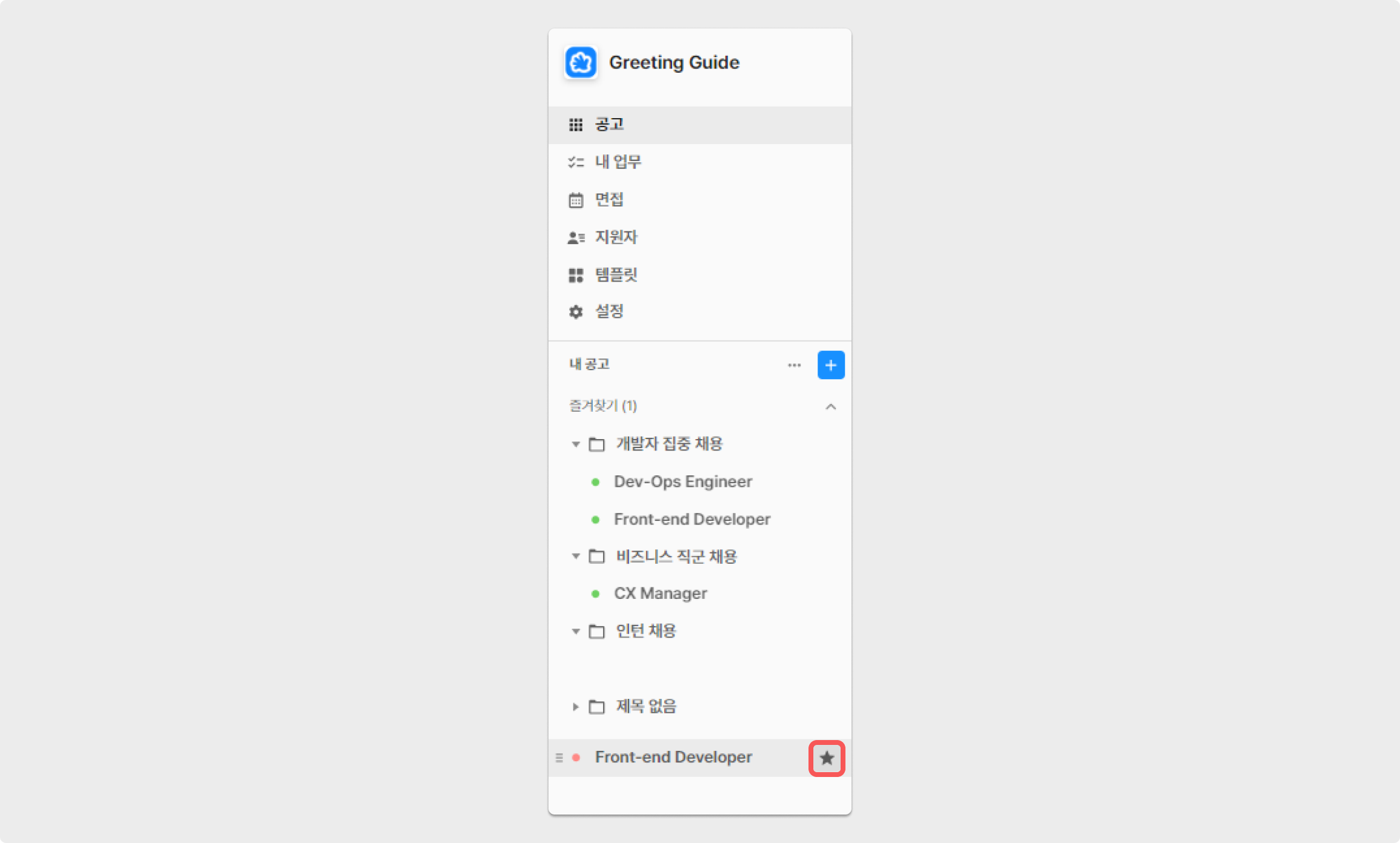 그리팅을 통해 생성한 공고를 그룹별로 구분해 관리할 수 있습니다. 예로, '비즈니스 직군 채용'과 '개발자 집중 채용'의 폴더를 생성한 후 각 공고를 해당하는 폴더로 이동 해보세요. 그룹은 [공고 리스트] 영역에서 상단에 위치하고 그 순서를 변경할 수 있어, 공고 관리가 더욱 용이해집니다.