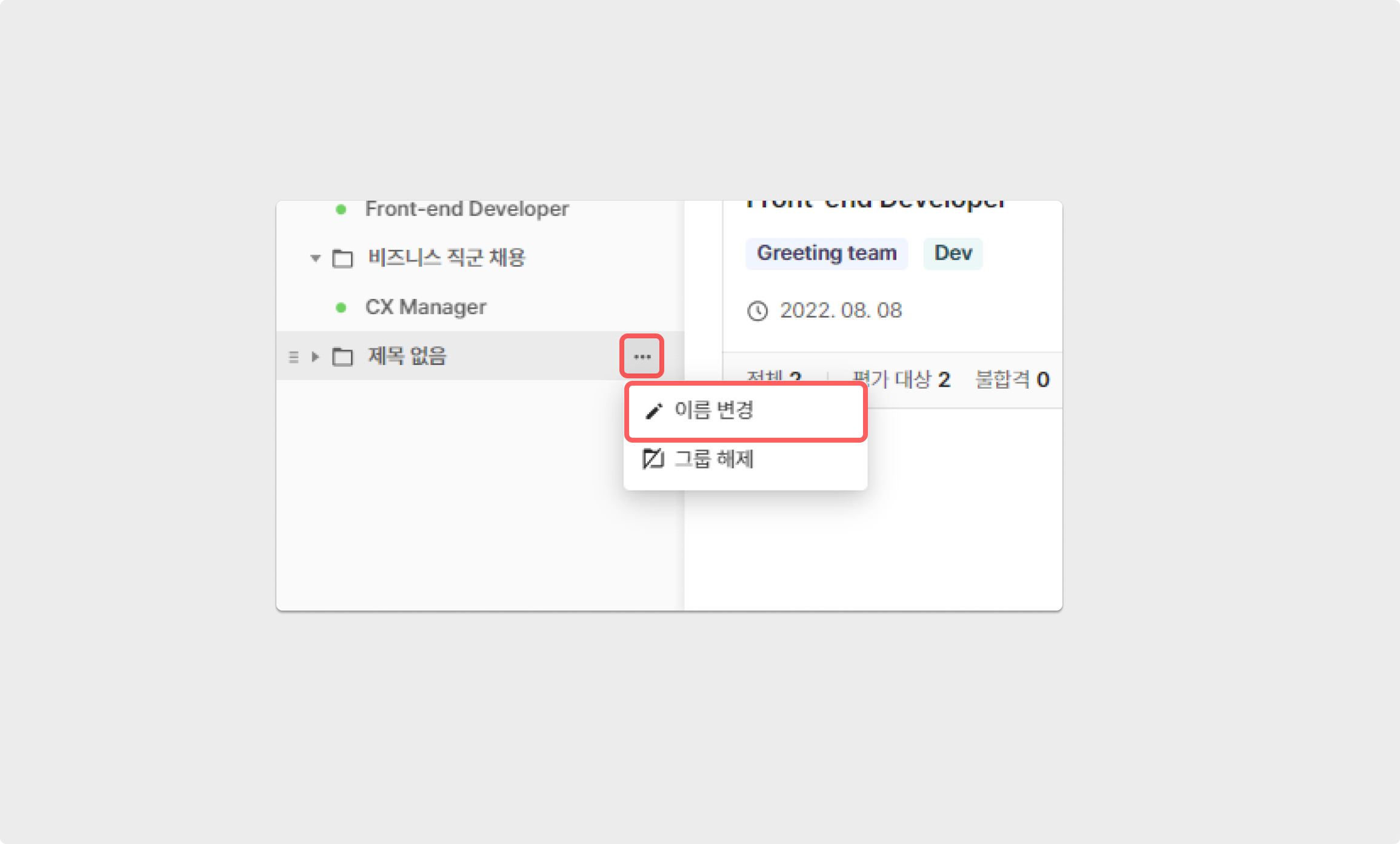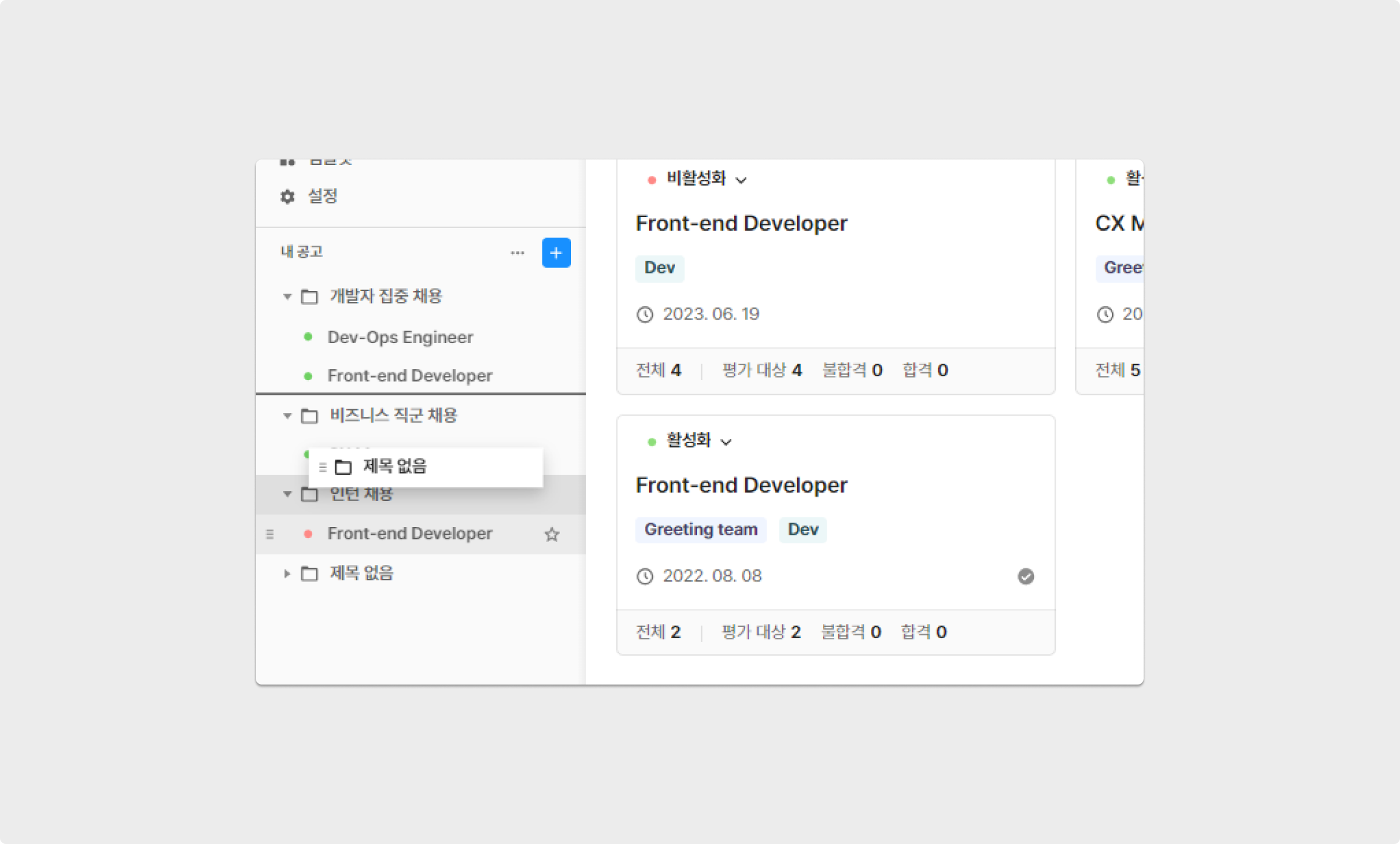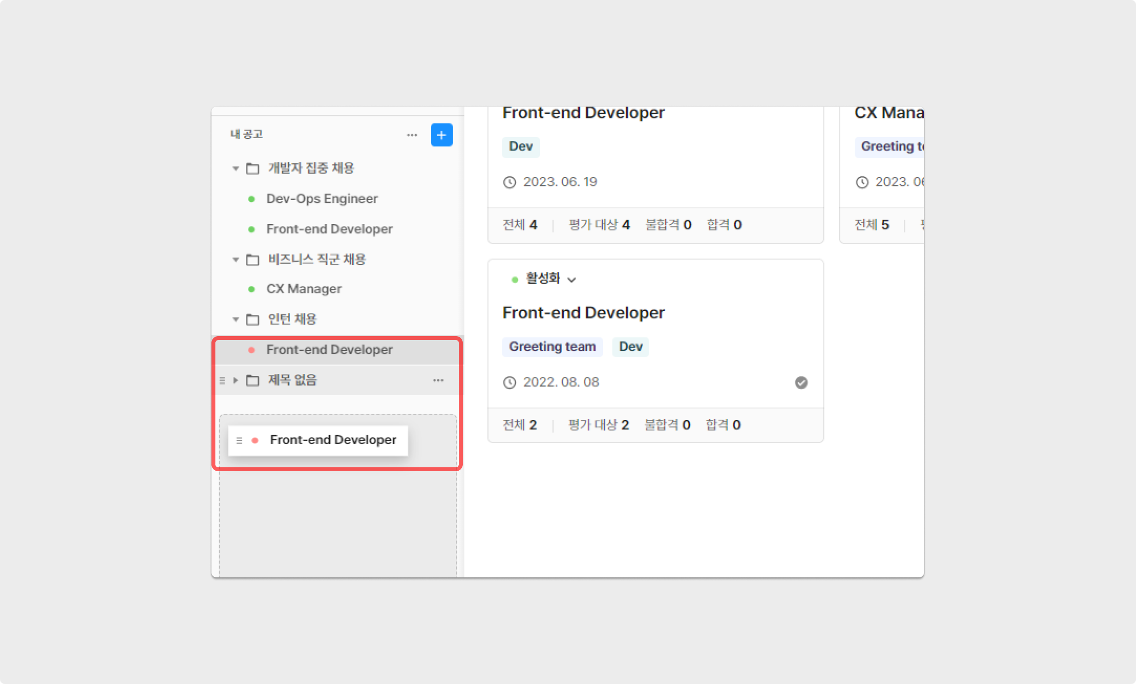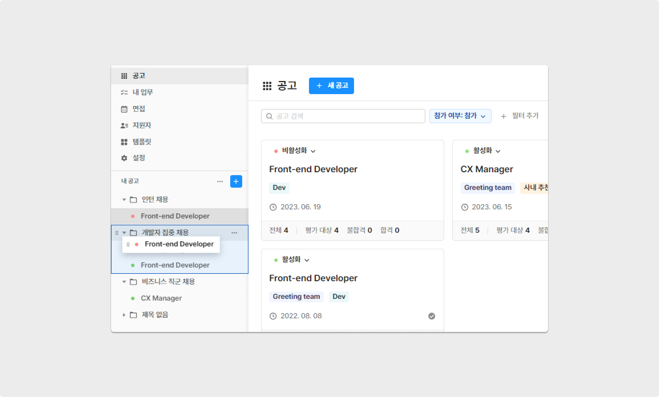 그리팅을 통해 생성한 공고를 그룹별로 구분해 관리할 수 있습니다. 예로, '비즈니스 직군 채용'과 '개발자 집중 채용'의 폴더를 생성한 후 각 공고를 해당하는 폴더로 이동 해보세요. 그룹은 [공고 리스트] 영역에서 상단에 위치하고 그 순서를 변경할 수 있어, 공고 관리가 더욱 용이해집니다.