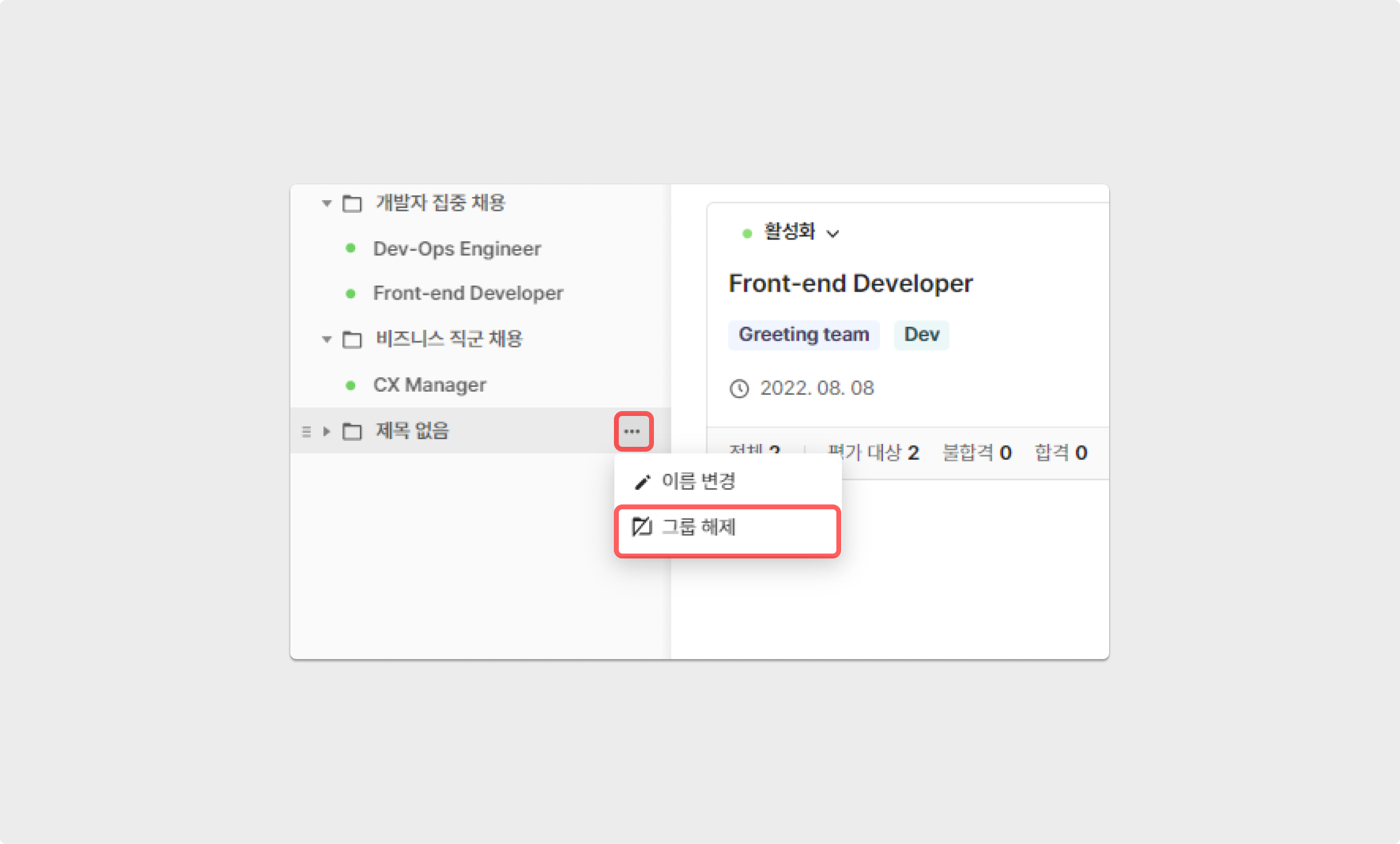 또한, 각 그룹의 [더보기(점 세 개 모양)] → [그룹 해제]를 통해 그룹을 삭제하고 기존에 속한 공고는 기본 공고 리스트로 되돌아갑니다.