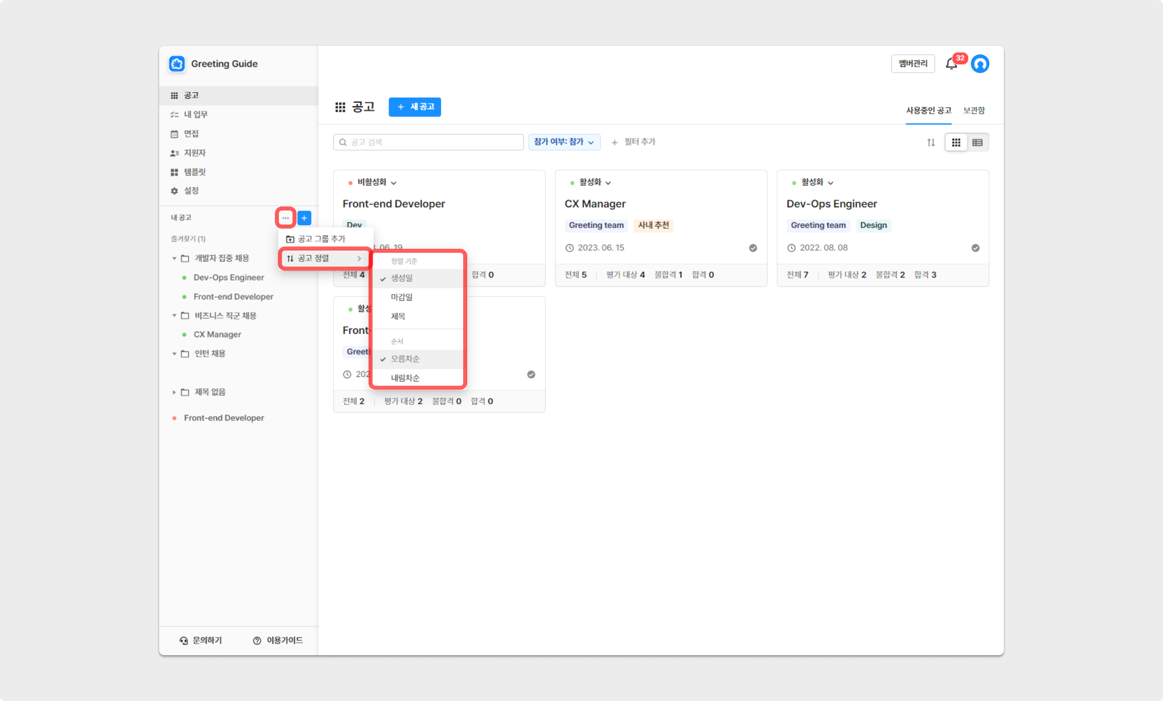 좌측 [공고 리스트] 영역에 노출되는 공고의 절렬 기준을 [더보기(점 세 개 모양)] → [공고 정렬] 버튼을 통해 변경할 수 있습니다.
