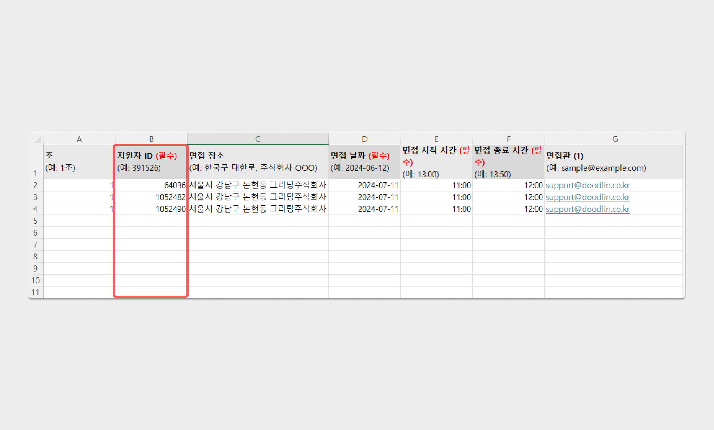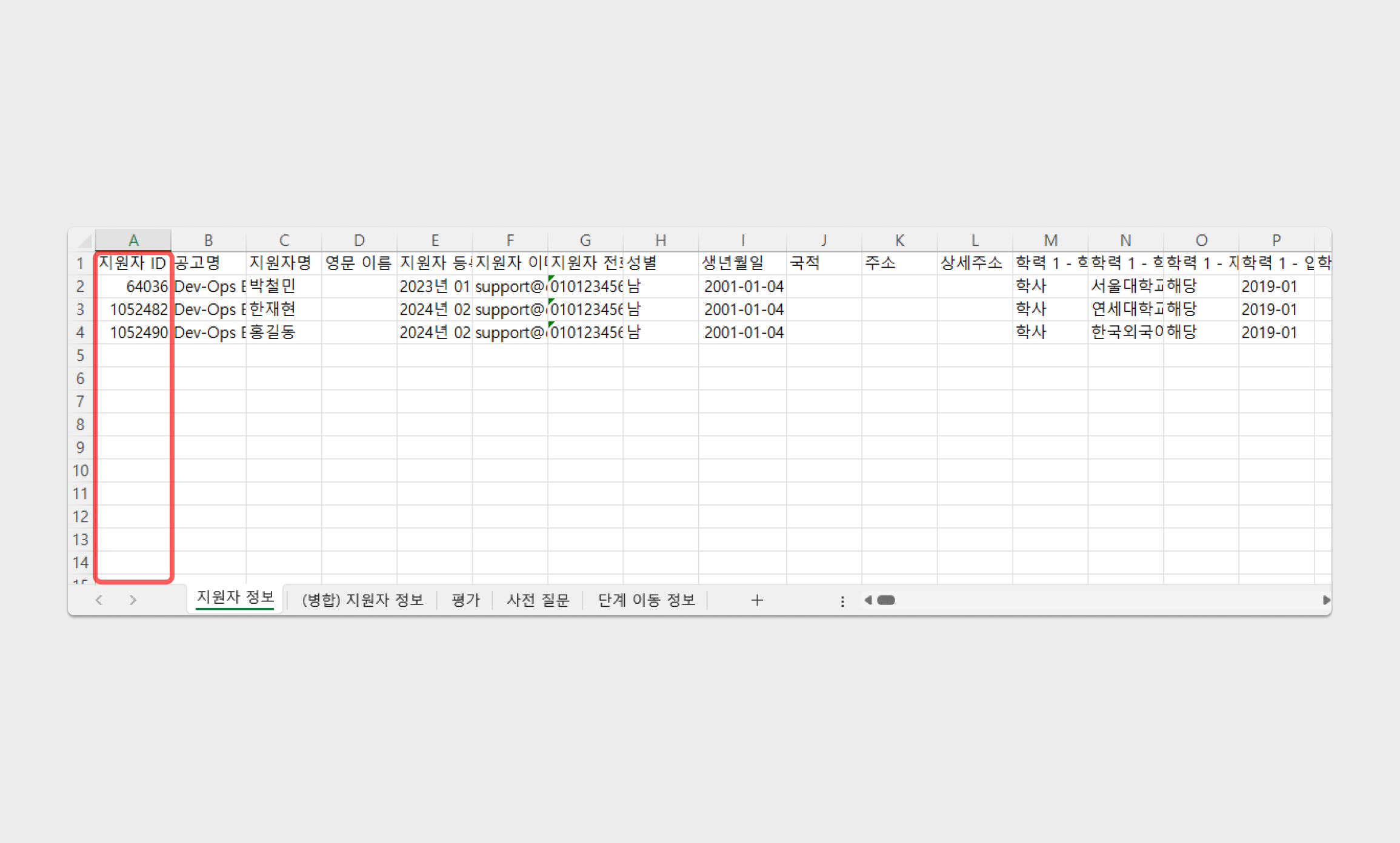 지원자 정보 엑셀 파일 내 면접 생성을 희망하는 지원자를 선별하여, 해당 지원자 ID를 복사해 주세요.