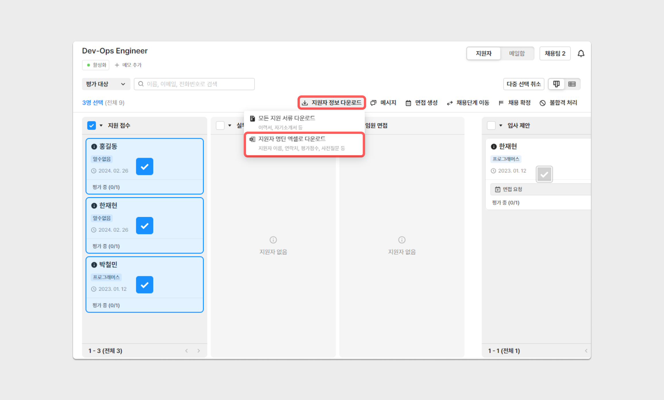 다중 선택 → 지원자 선택 → 지원자 정보 다운로드 → 지원자 명단 엑셀로 다운로드