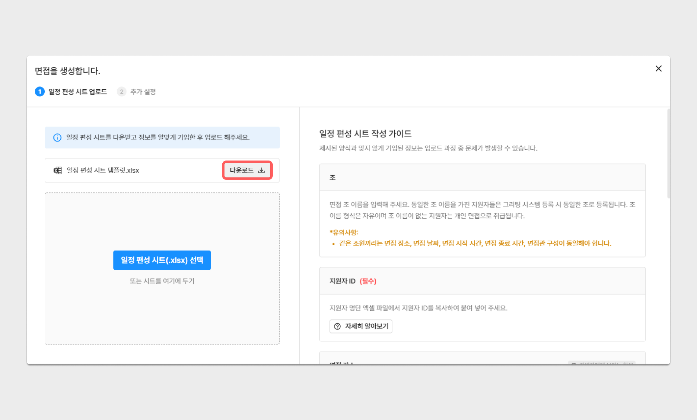 면접을 생성할 지원자의 정보를 엑셀로 다운로드해 주세요.