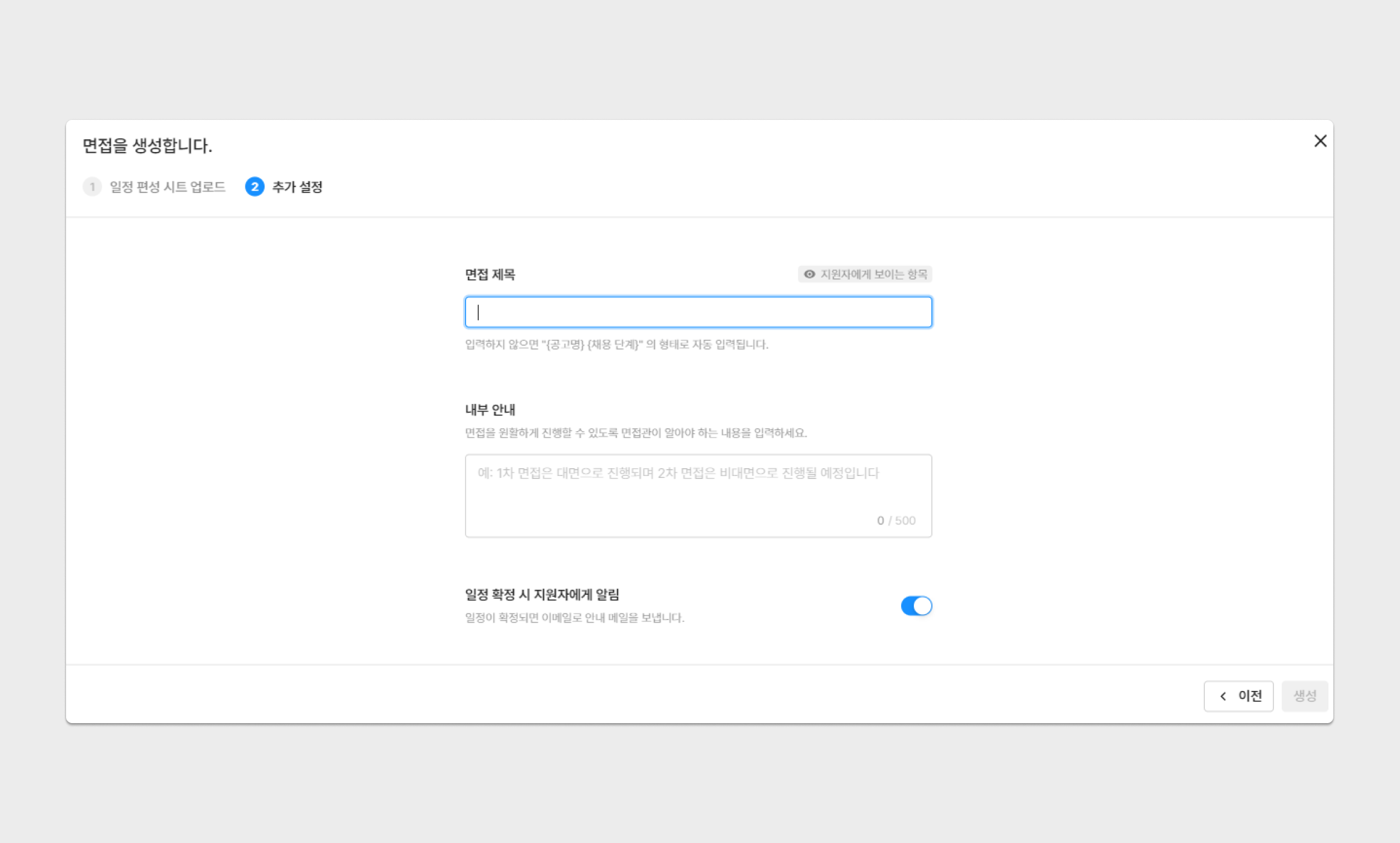2. 추가 설정을 통해 면접 제목, 내부 안내, 일정 확정 시 지원자 알림 여부, 캘린더 비공개 등록설정한 후 생성해 주세요.