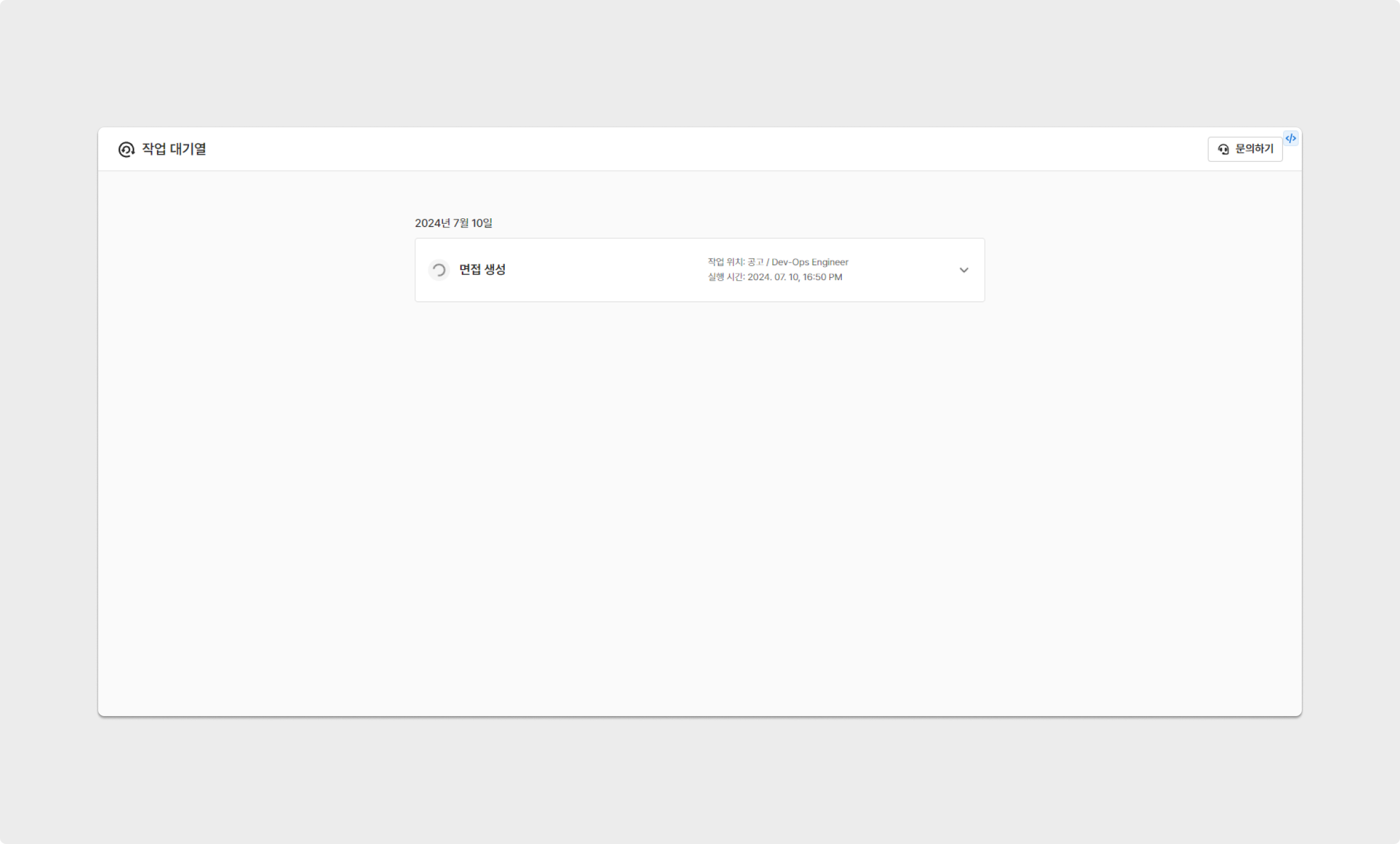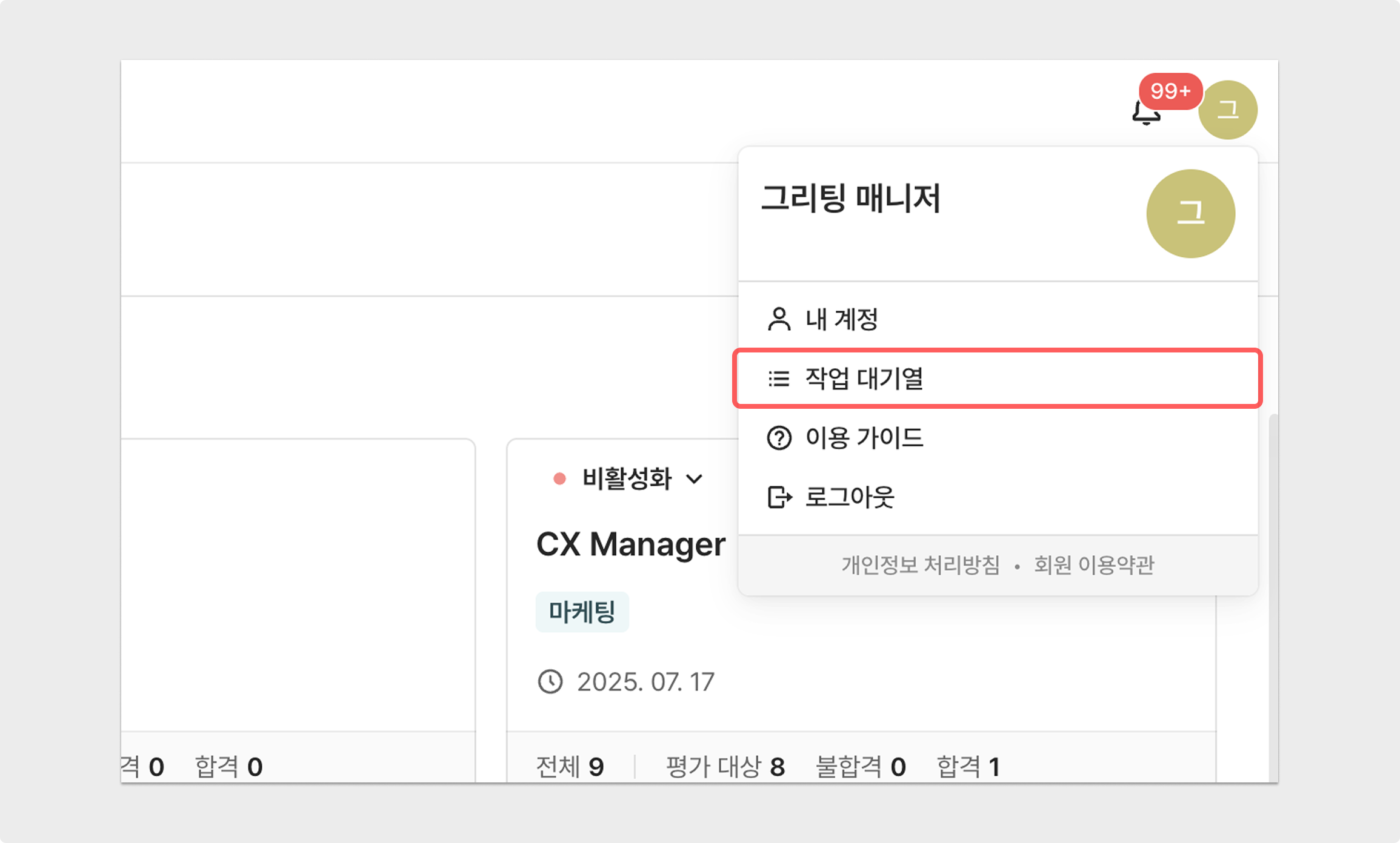 요청한 면접 일정은 워크스페이스 우측 상단 '프로필 → 작업 대기열'을 통해 작업 진행 상황을 확인할 수 있습니다.
