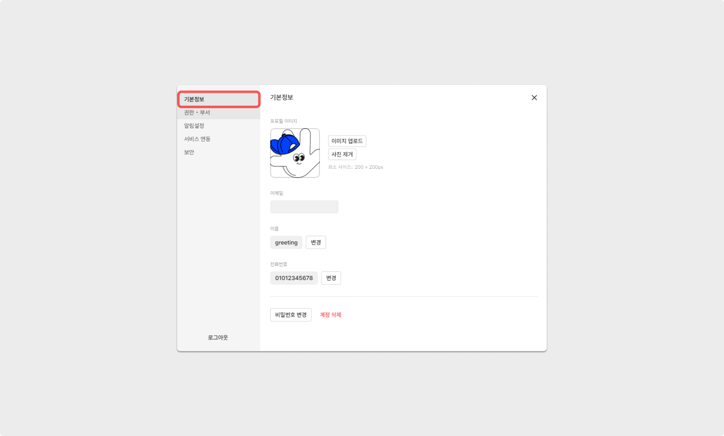 이후, [기본정보] 탭을 통해, [프로필 이미지]를 업로드하거나 [사용자 이름], [전화번호], [비밀번호]를 변경할 수 있습니다.