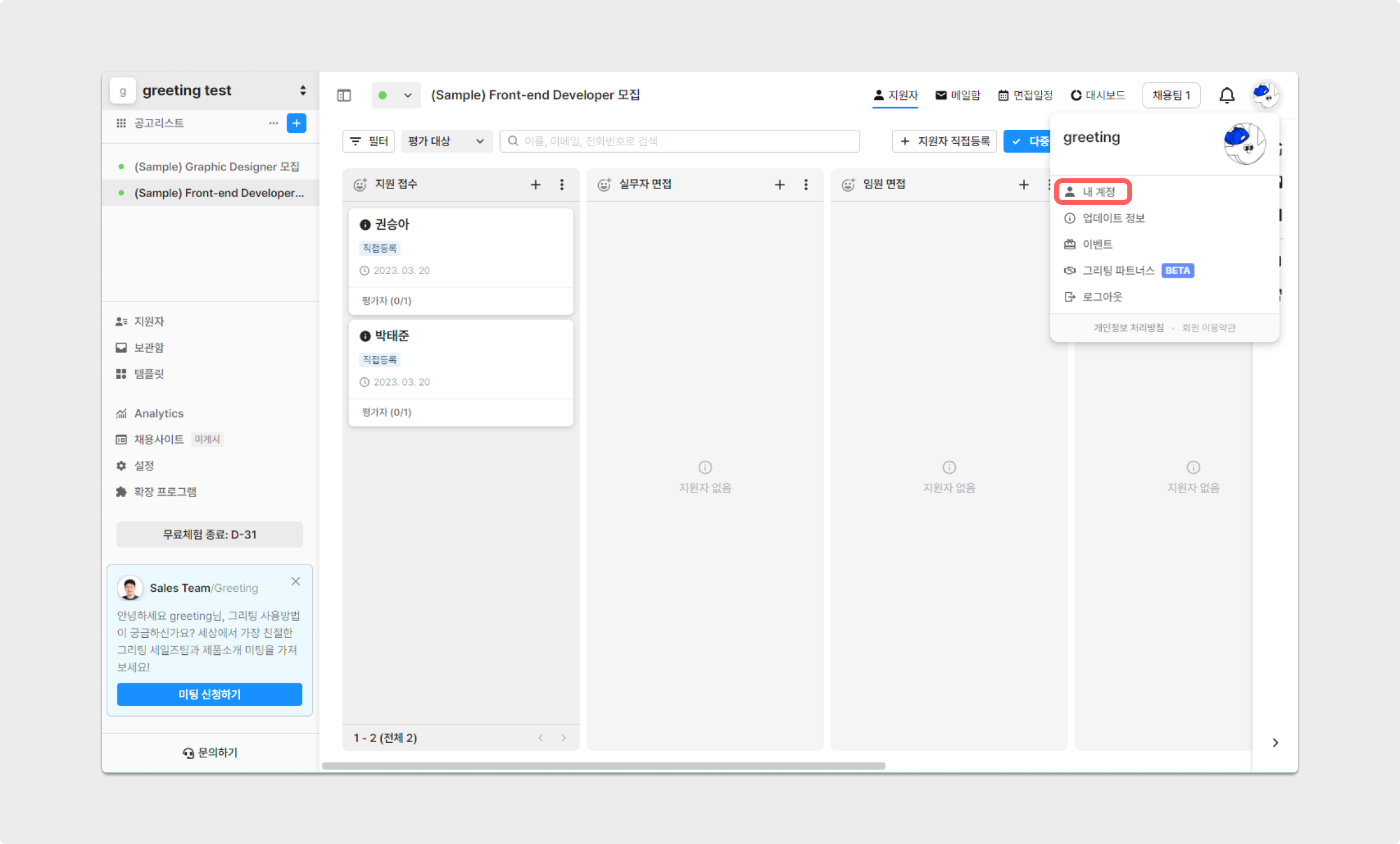 우측 상단의 프로필 이미지를 클릭한 후, [내 계정]을 클릭해 주세요.