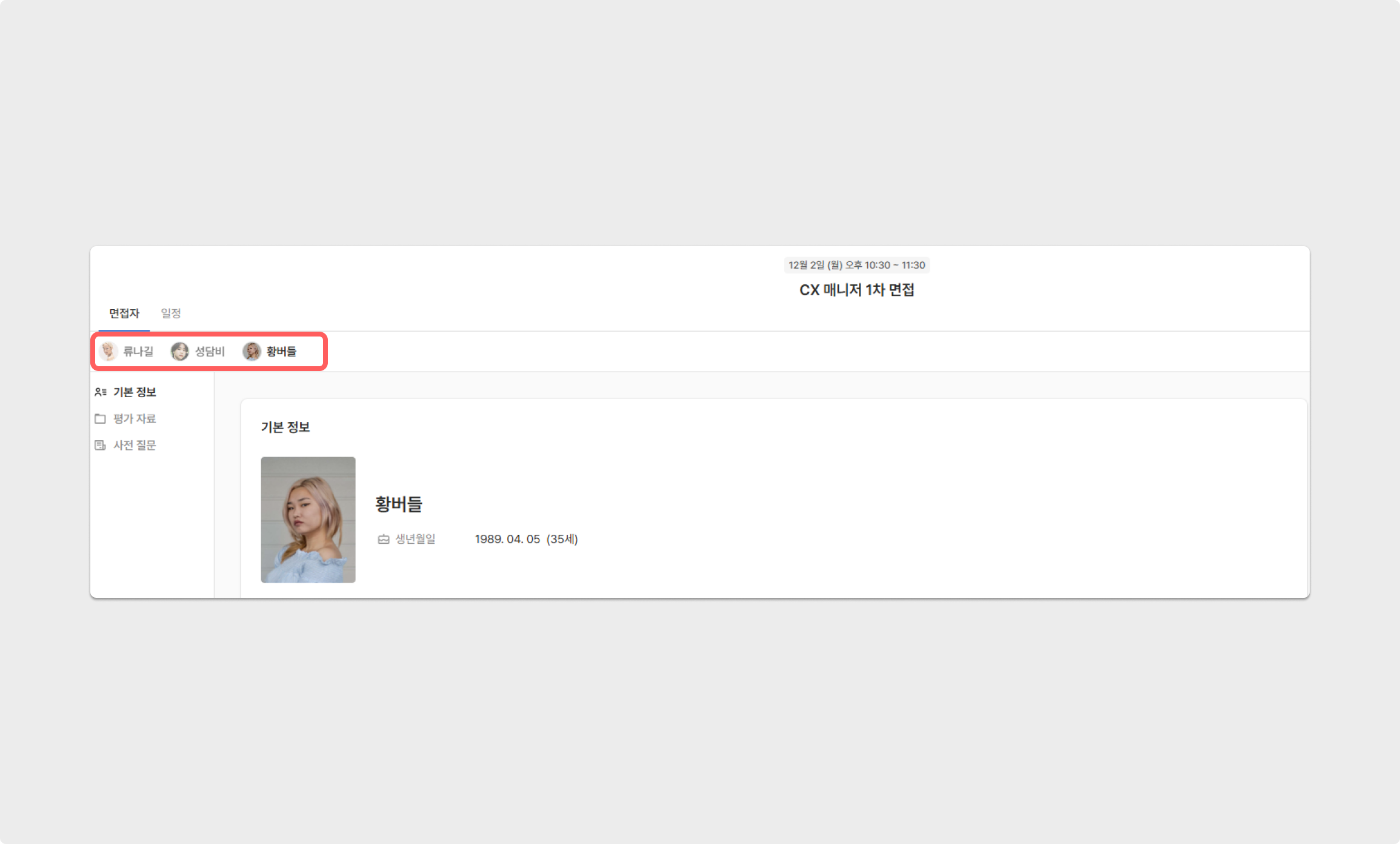 하나의 면접 일정 내 포함된 지원자를 확인할 수 있으며,