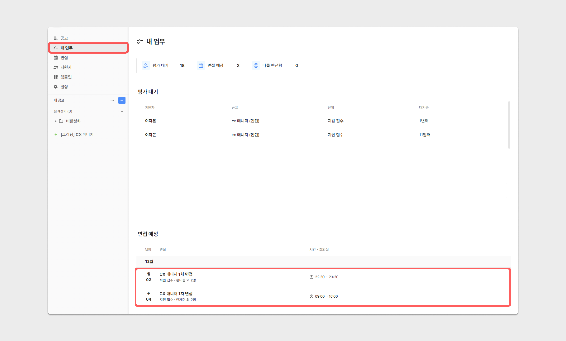 워크스페이스 [내 업무] 페이지의 하단 면접 예정 리스트를 클릭하여 접근할 수 있습니다.