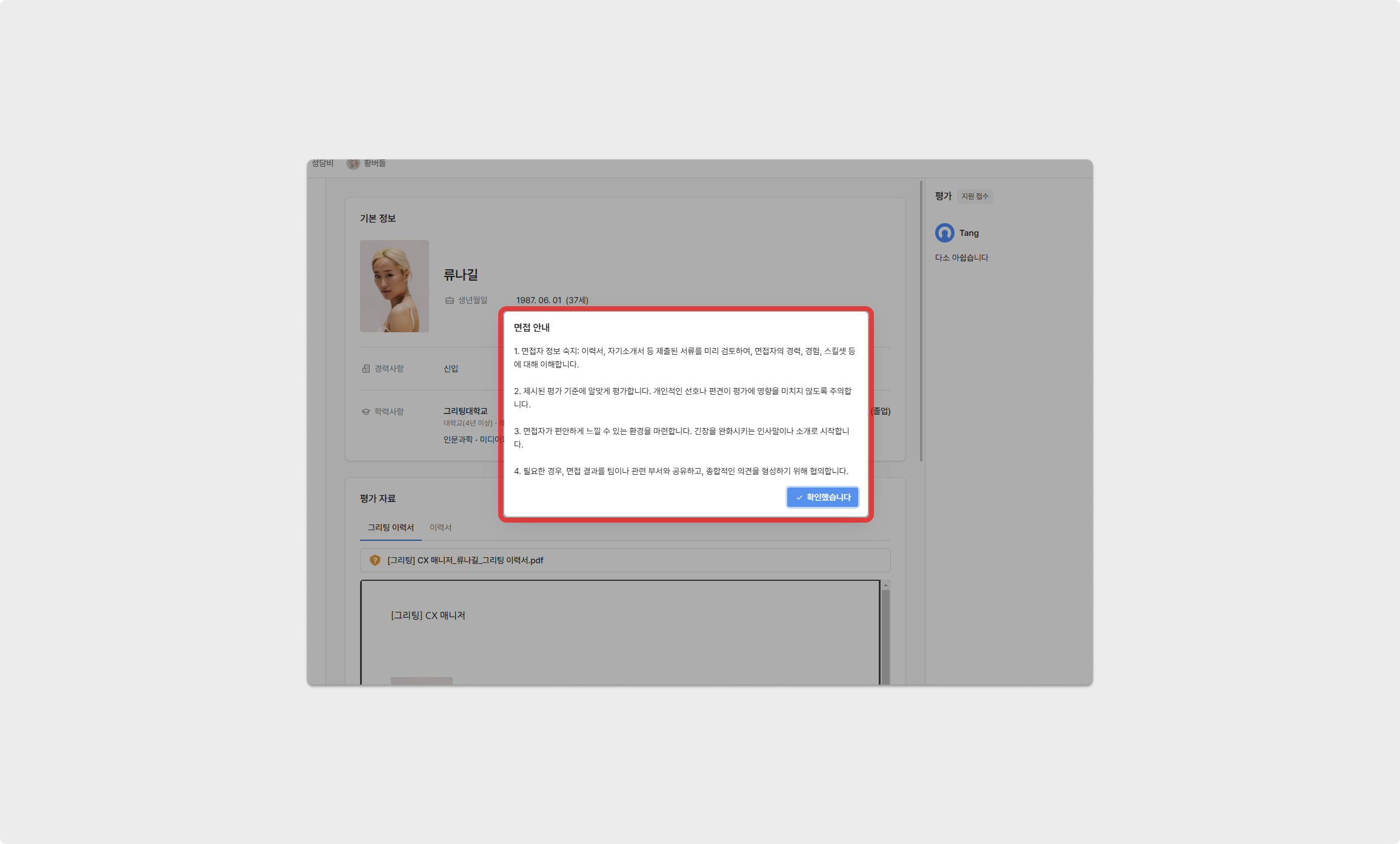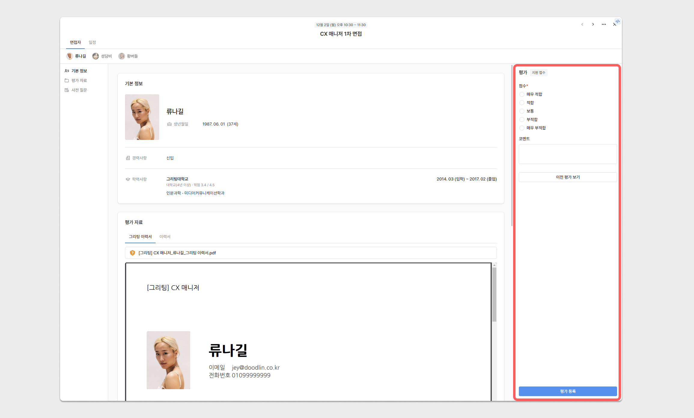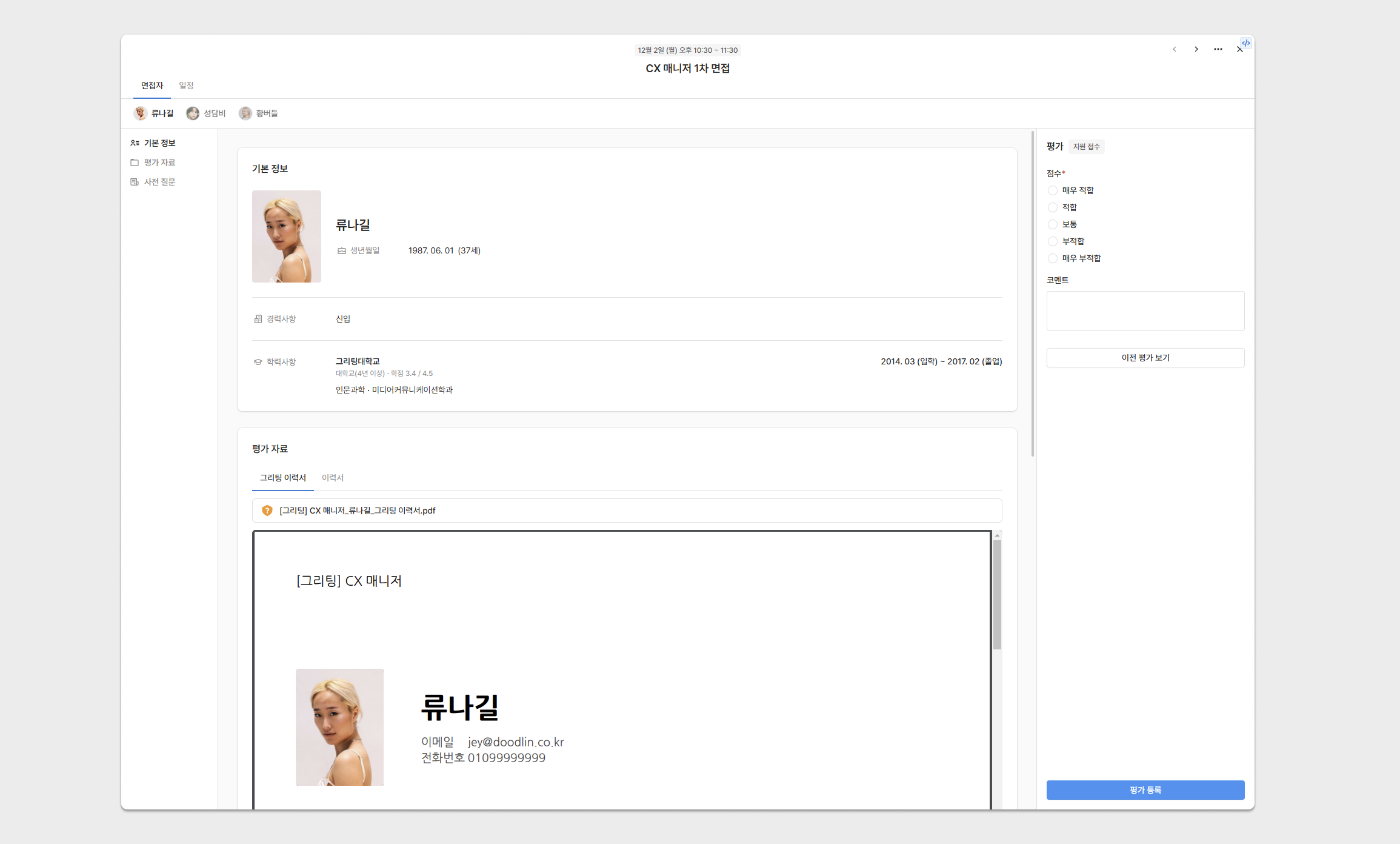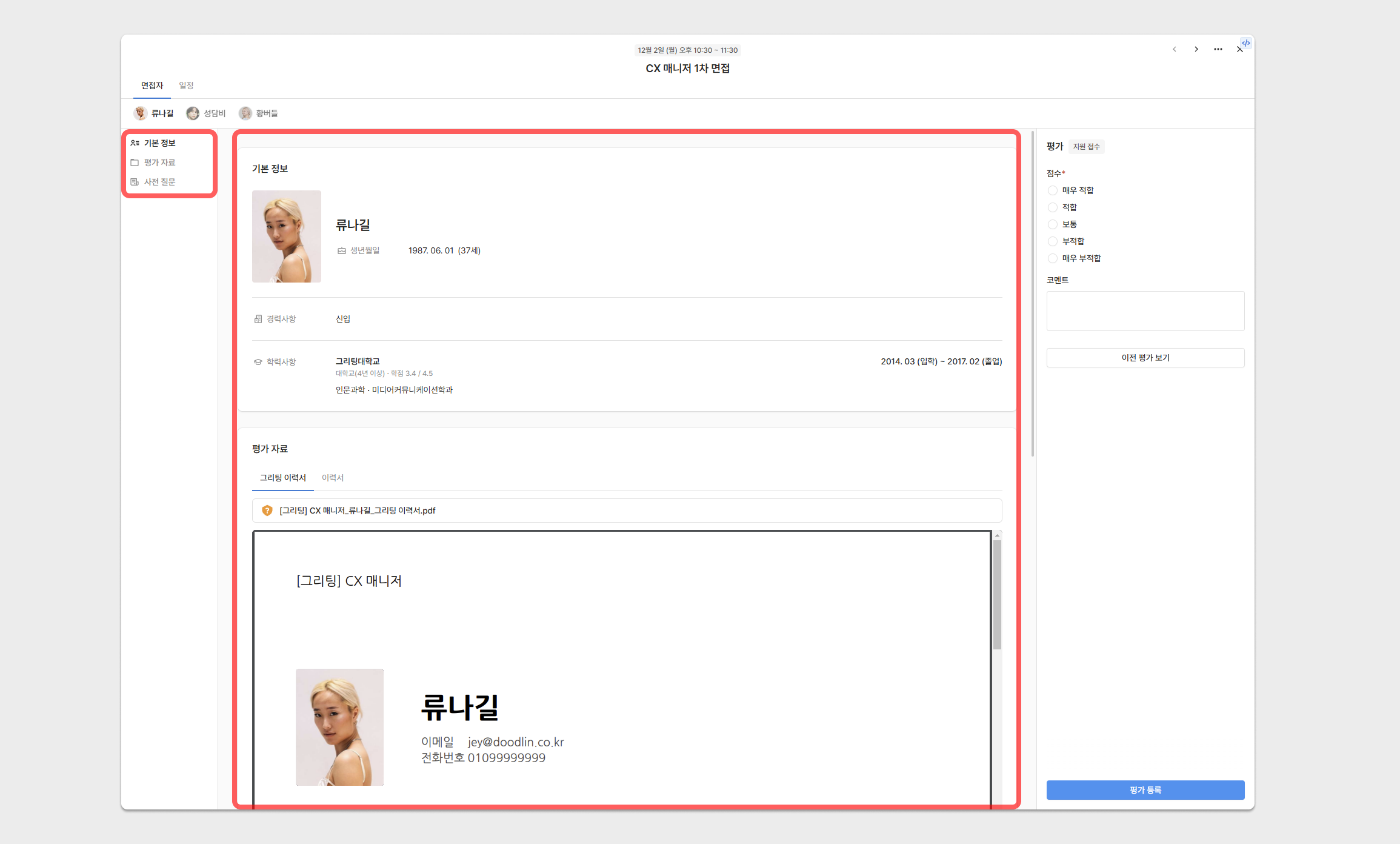 면접 대상자가 제출한 기본 정보, 평가 자료, 사전 질문을 확인할 수 있습니다.