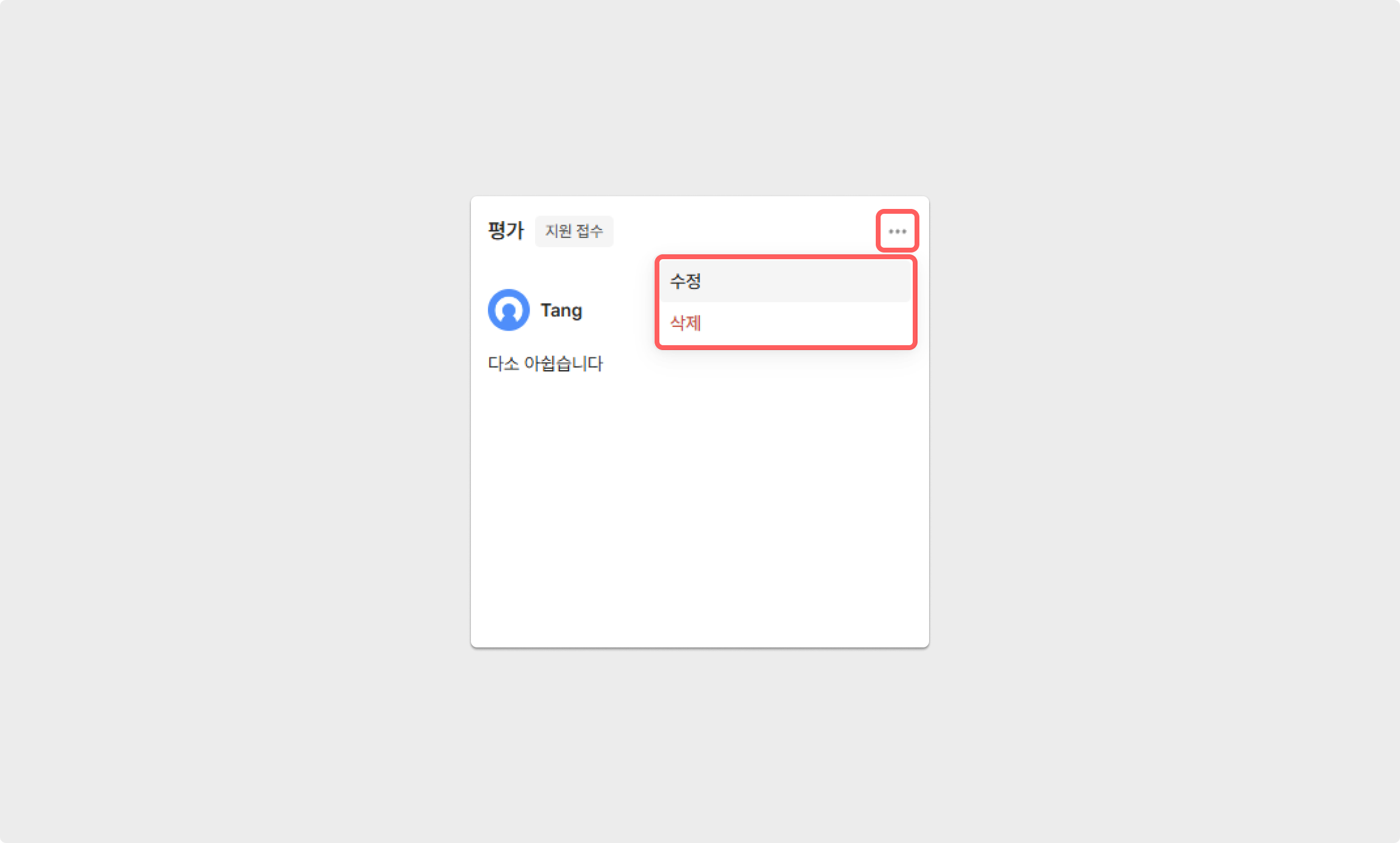 화면 우측에서 평가를 작성할 수 있으며, 작성한 평가는 더보기 버튼으로 수정, 삭제할 수 있습니다.
