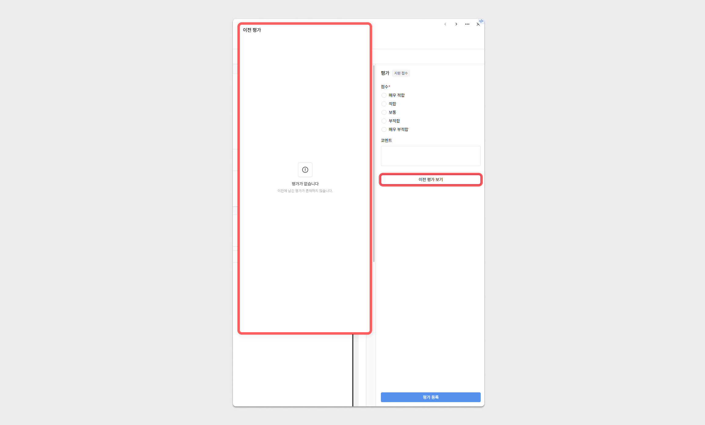 지원자 상세정보 내에서 동일한 채용단계에 작성한 평가가 있다면 평가 등록이 불가합니다.