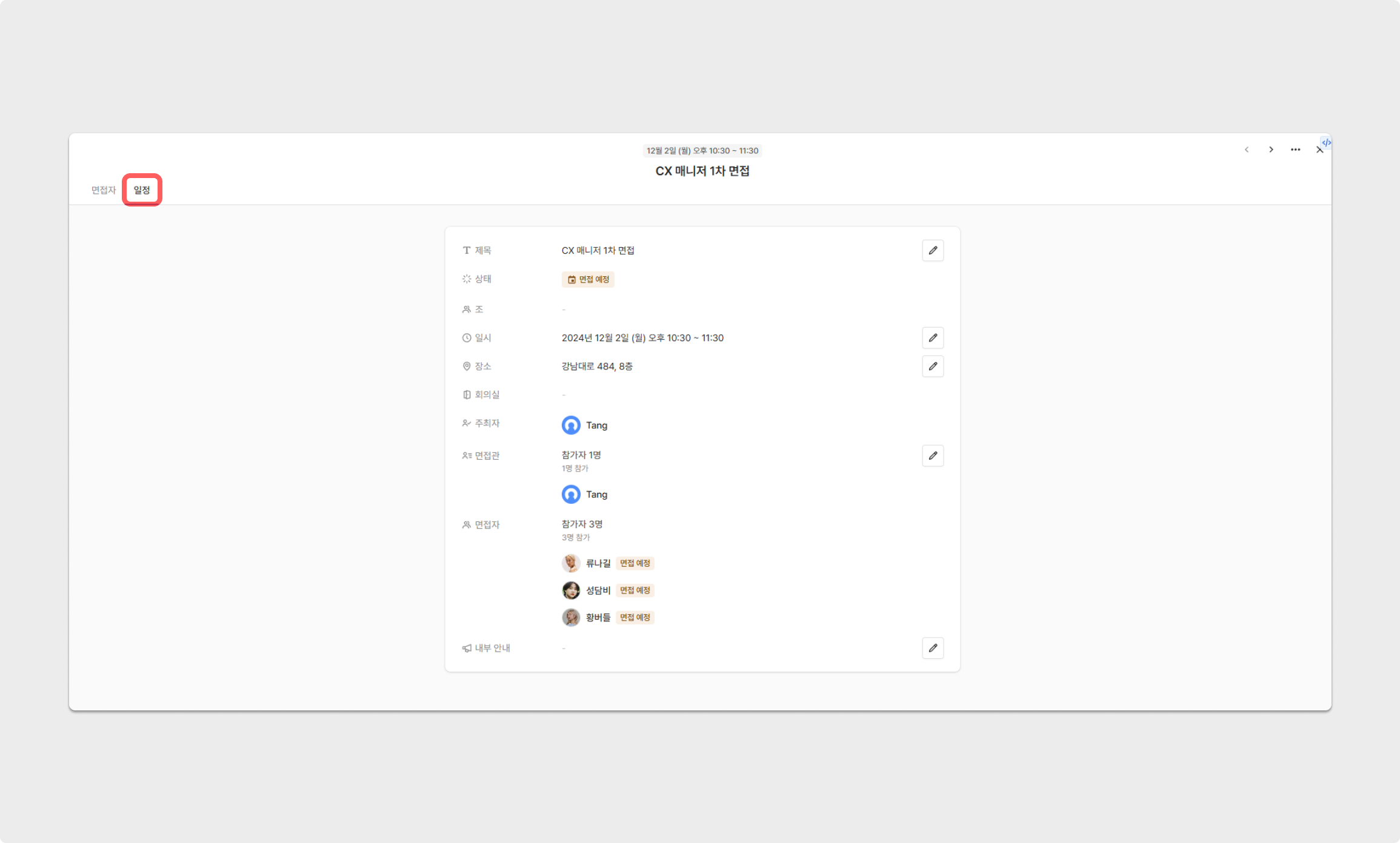 일정 화면에서 면접과 관련된 아래의 정보들을 확인할 수 있으며, 메일, 문자 메시지 보내기 권한을 가진 멤버는 면접 정보를 수정할 수 있습니다.