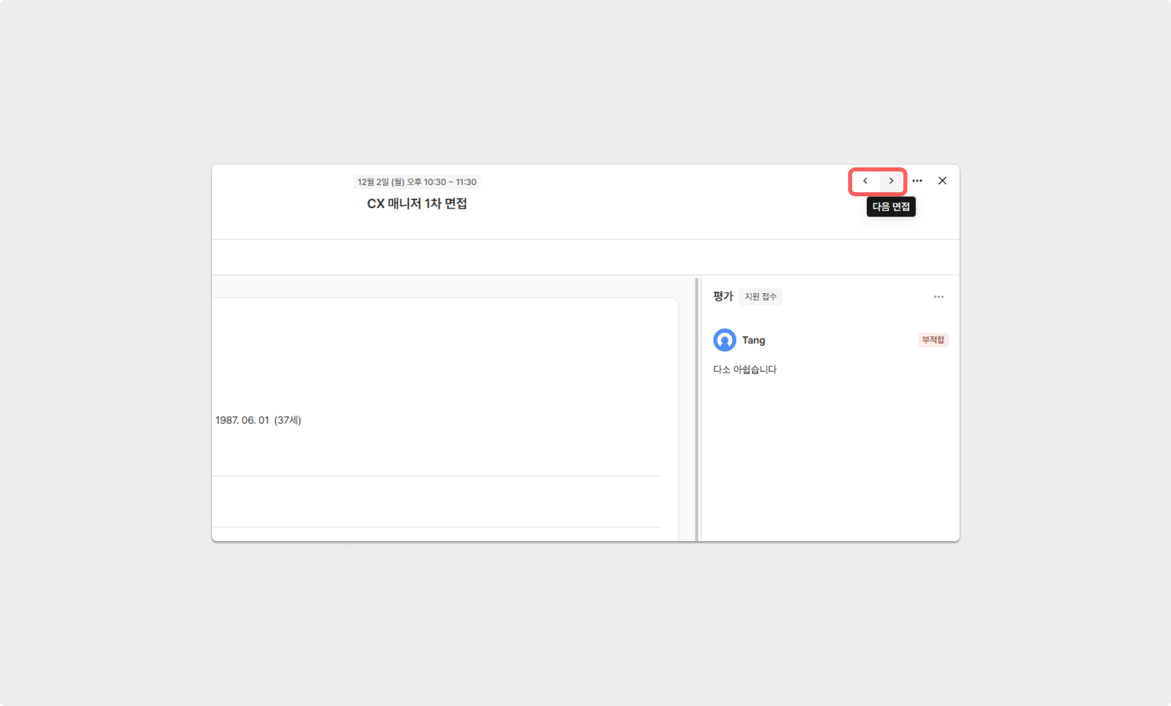 면접관뷰 우측 상단의 <> 버튼으로 이전, 다음 면접 이동이 가능합니다.