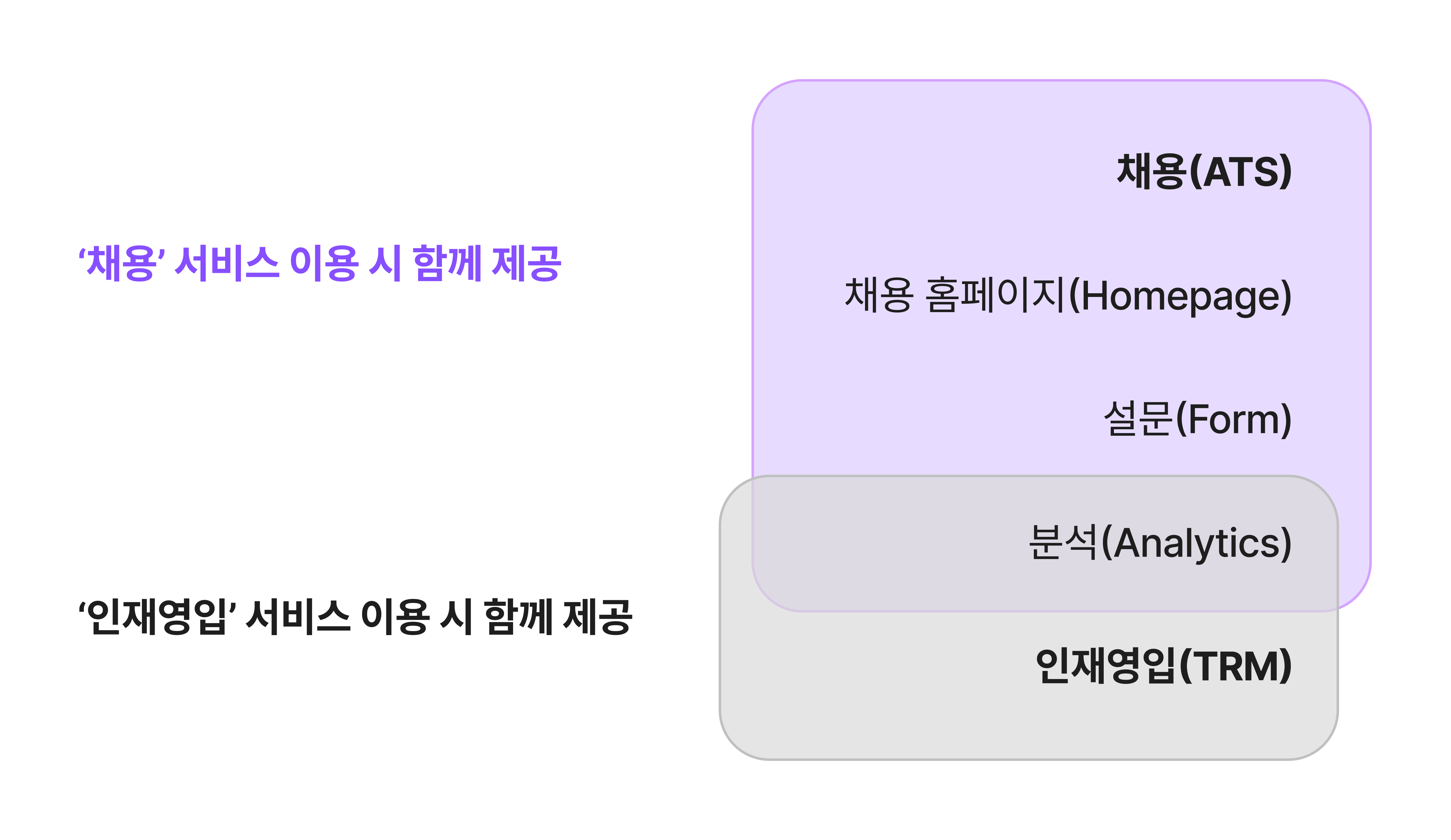 ‘채용(ATS)’ 서비스를 이용하면 플랜에 따라 '채용 홈페이지, 설문, 분석(채용 파트)' 서비스를 함께 제공하며,