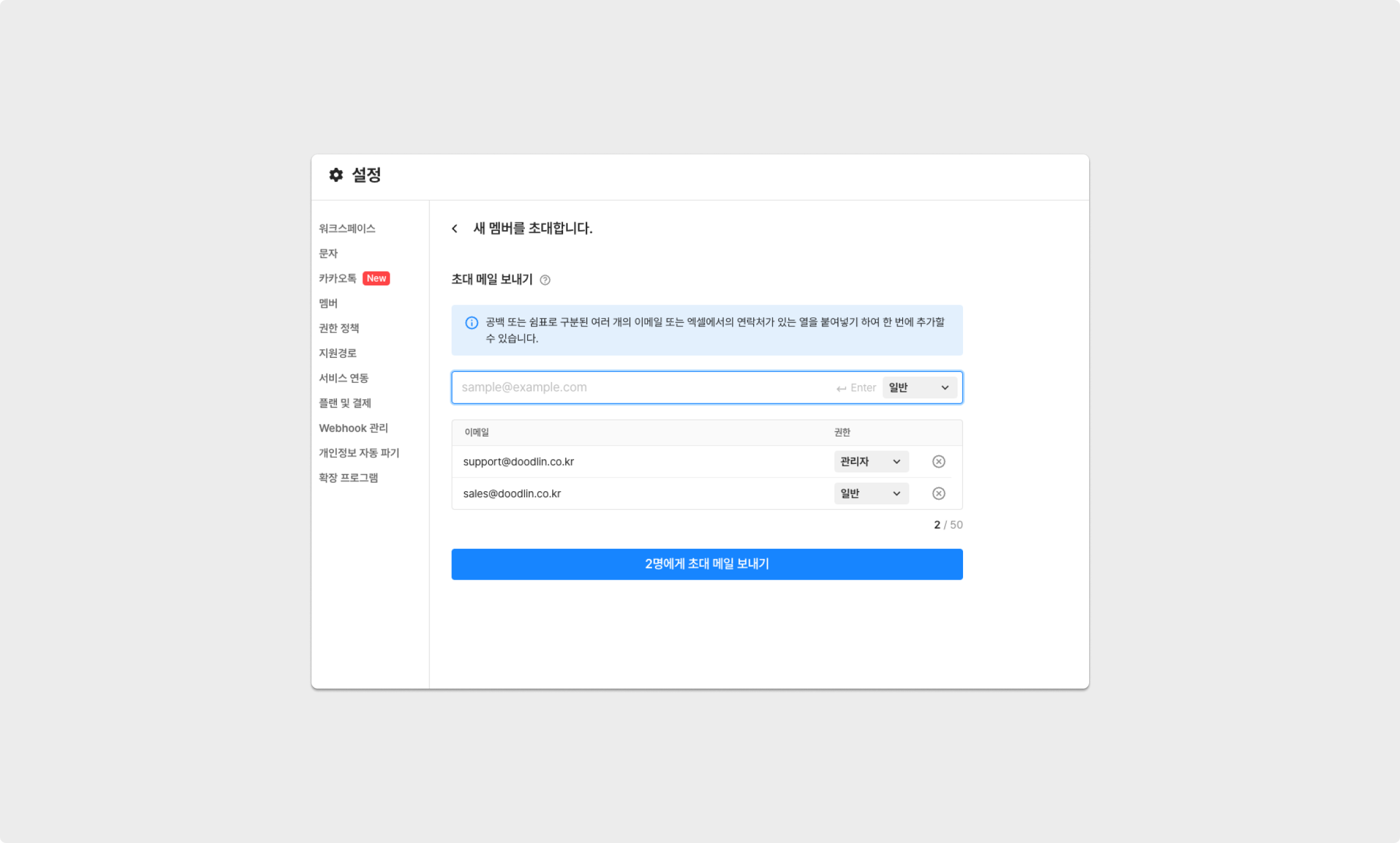 초대가 필요한 멤버의 이메일 주소를 기재하며 워크스페이스 역할을 설정할 수 있습니다.