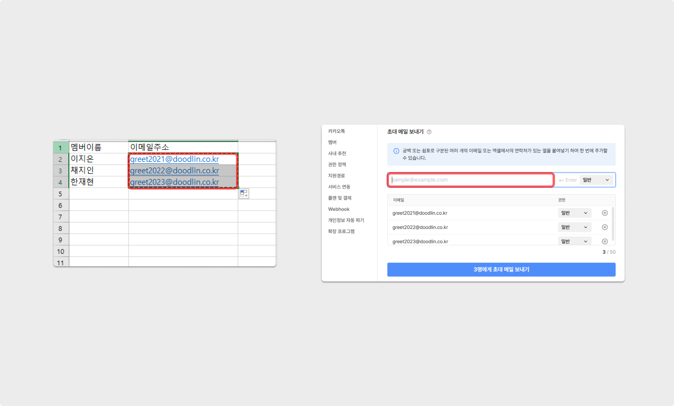이때, 공백 또는 쉼표로 구분된 여러 개의 이메일 또는 엑셀에서의 연락처가 있는 열을 붙여넣기 하여 한 번에 추가할 수 있습니다.