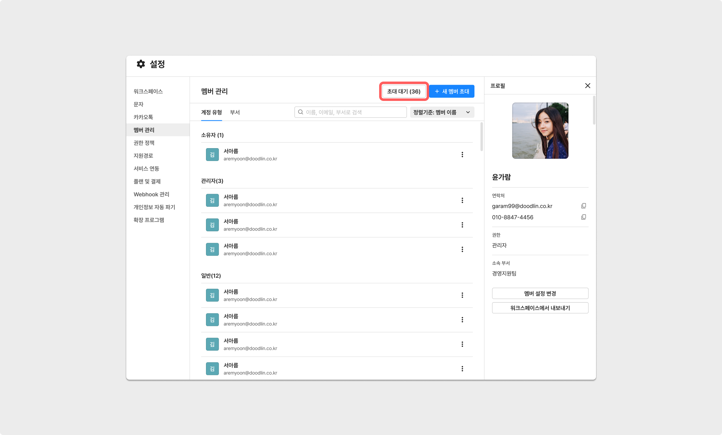 설정 → 멤버 → 초대 대기 버튼을 통해, 초대 메일 수신 대상자의 리스트를 확인할 수 있습니다.