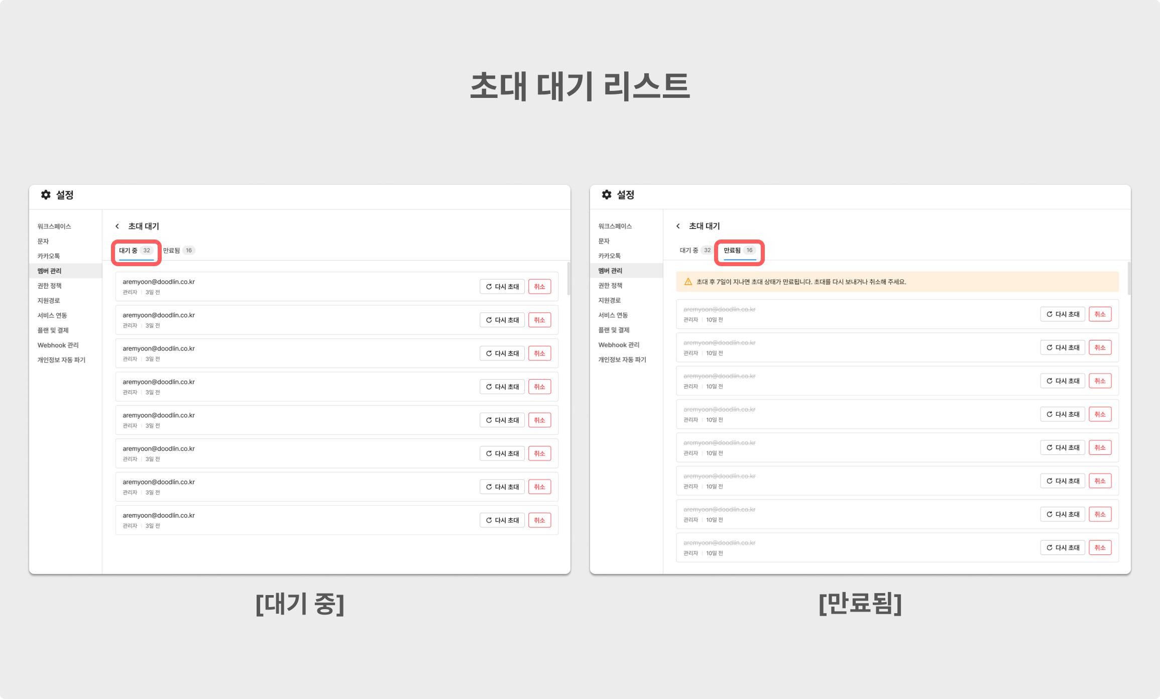 대기 중인 멤버와 초대 기간이 만료된 멤버를 확인할 수 있으며, 다시 초대할 수 있습니다.