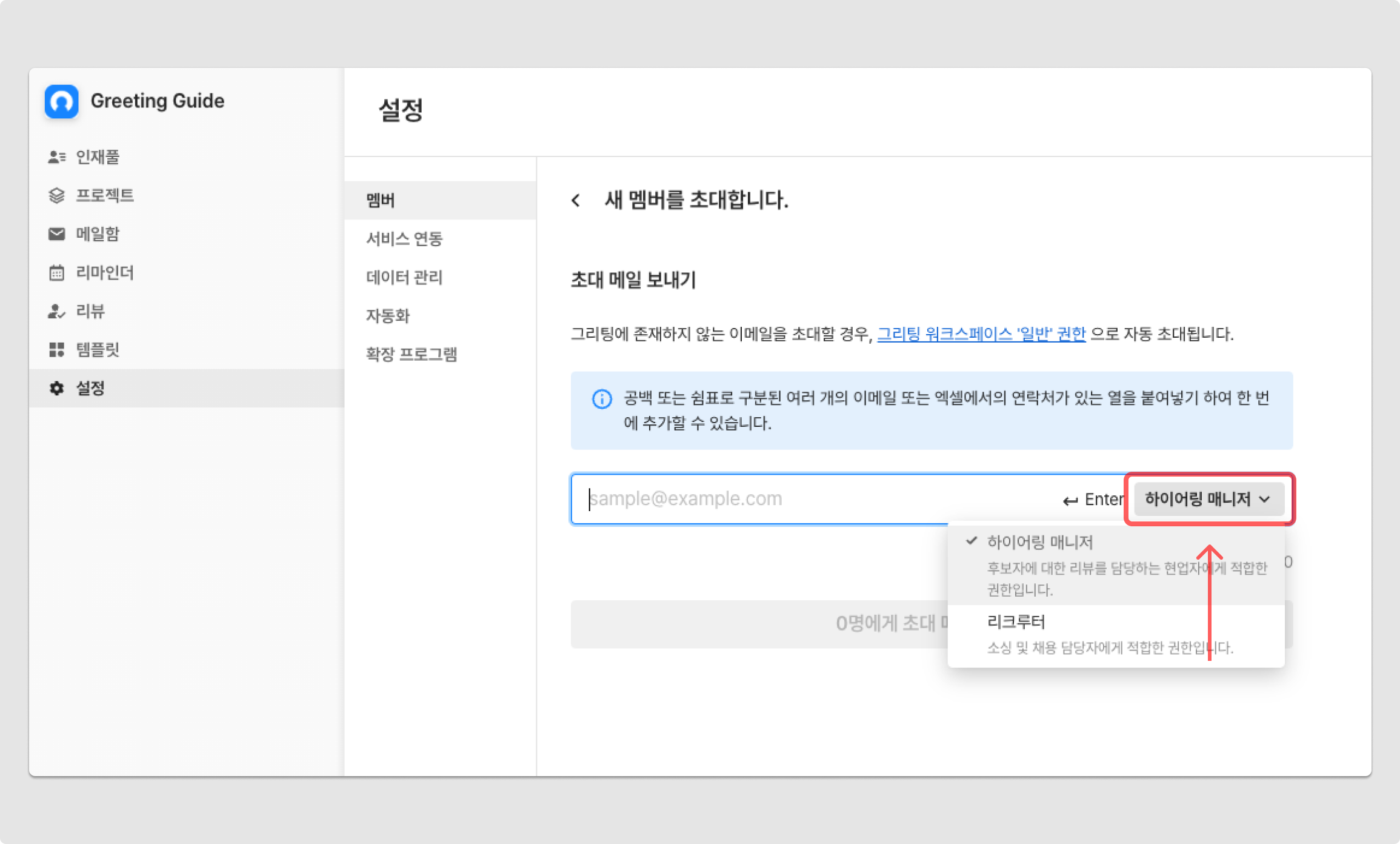 초대가 필요한 멤버의 이메일 주소를 기재하며 권한을 설정할 수 있습니다.