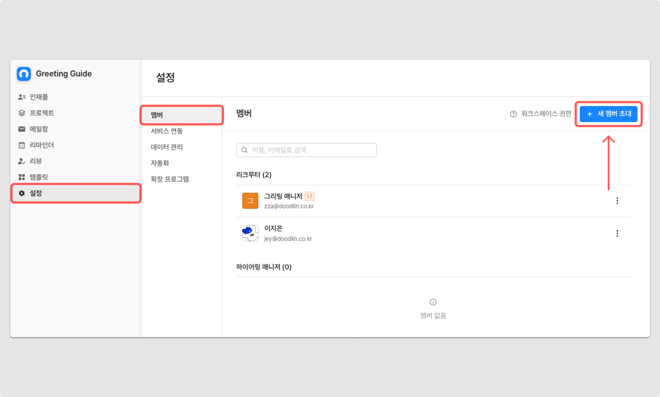 워크스페이스의 리크루터 권한 이용자가 설정 → 멤버 → + 새 멤버 초대 버튼을 통해, 초대할 멤버의 이메일을 입력할 수 있습니다.
