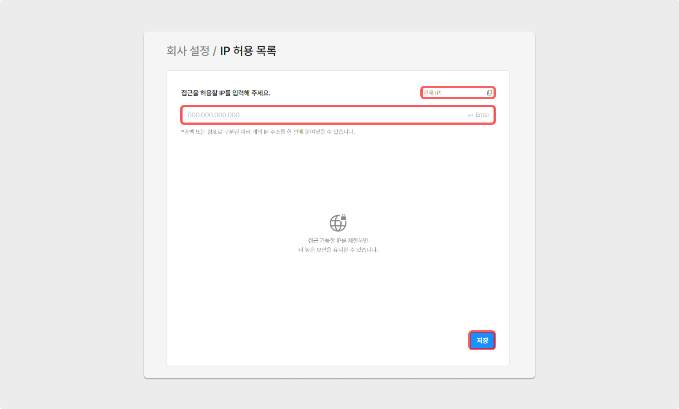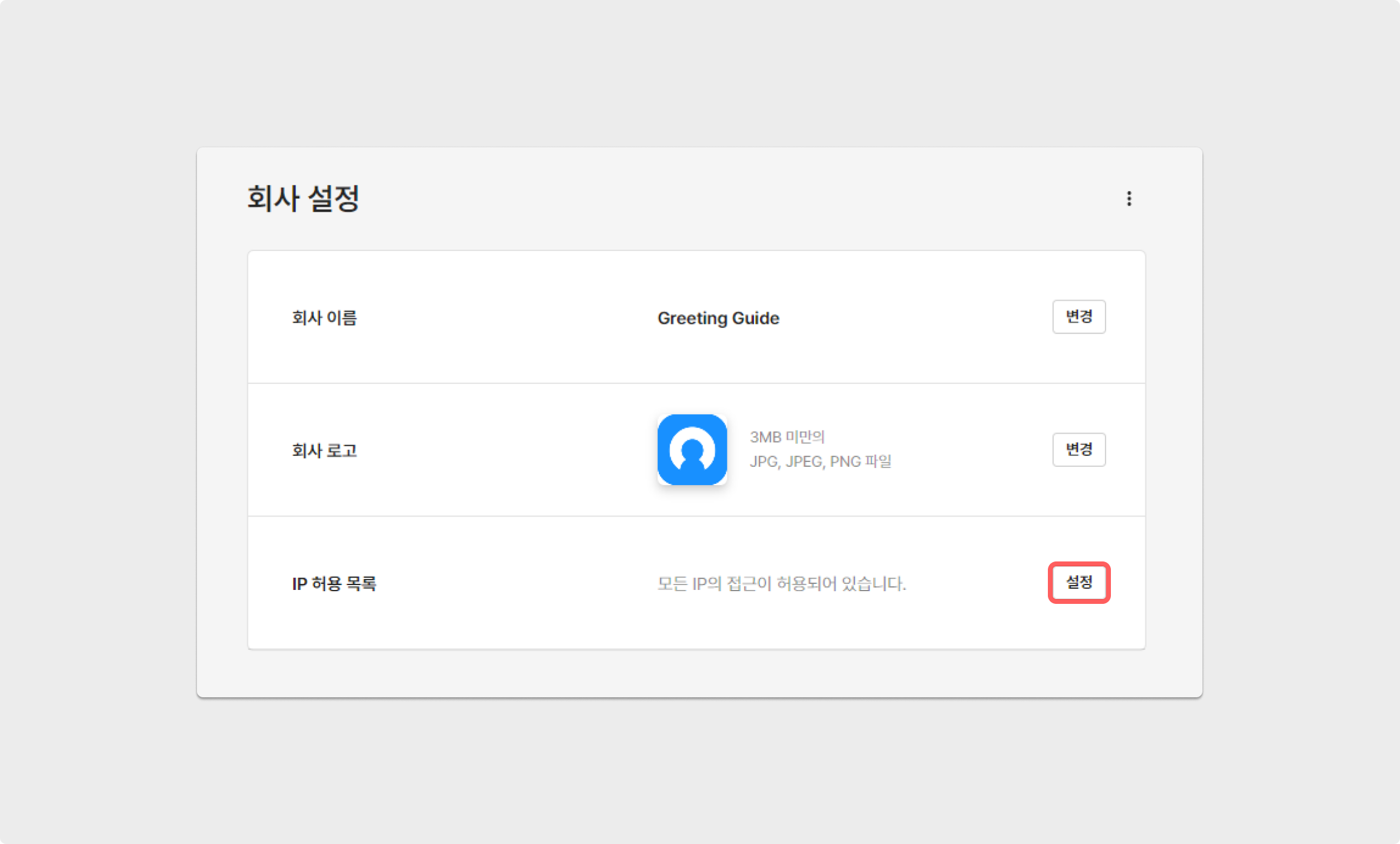 홈 화면 또는 워크스페이스에서 소유자 멤버가 회사 설정 → IP 허용 목록 → 설정 버튼을 통해, 허용하고자 하는 IP 리스트를 입력할 수 있습니다.
