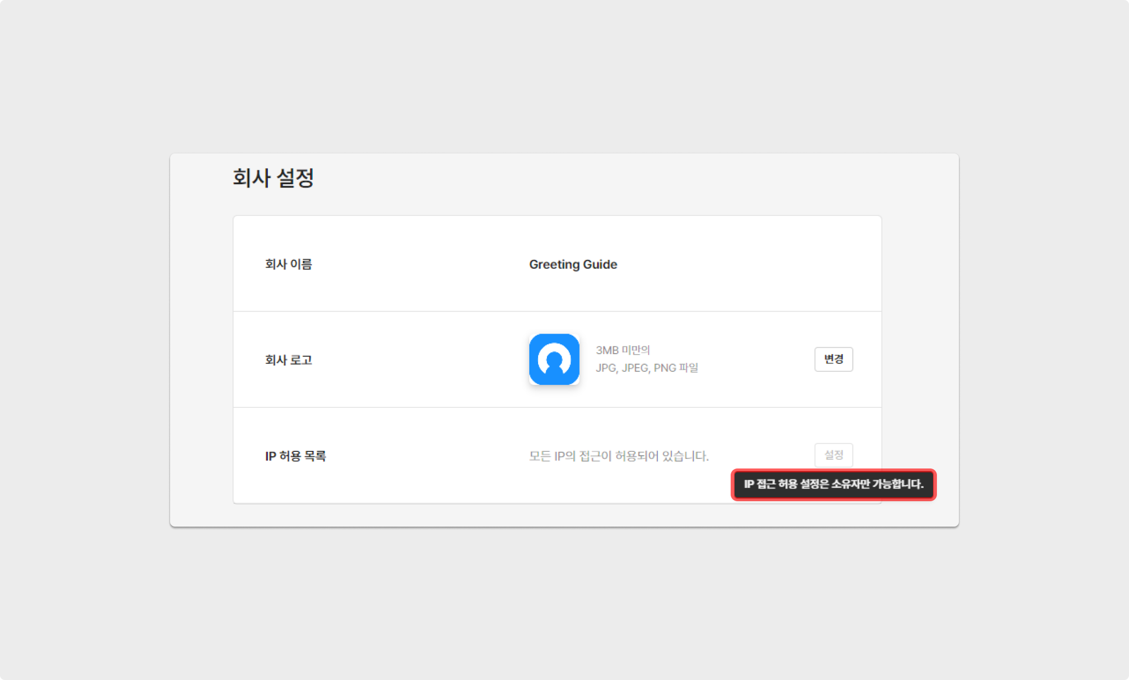 IP 접근 제한은 워크스페이스의 소유자 멤버가 설정할 수 있으며, 관리자, 일반 멤버는 해당 설정에 접근이 불가합니다.