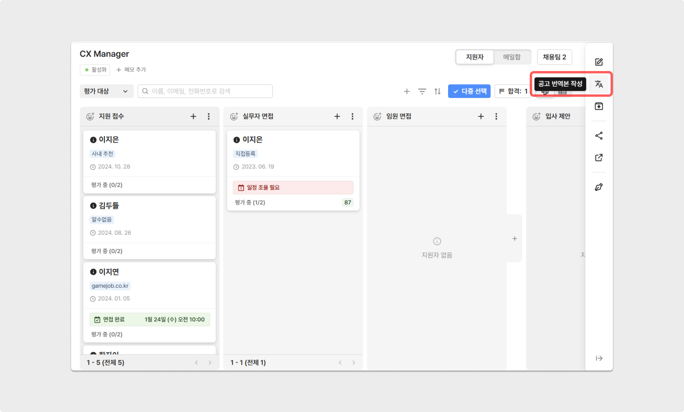 채용 홈페이지에서 지원자의 '언어 선택'에 따라 공고의 번역본 및 컨텐츠를 관리할 수 있습니다.