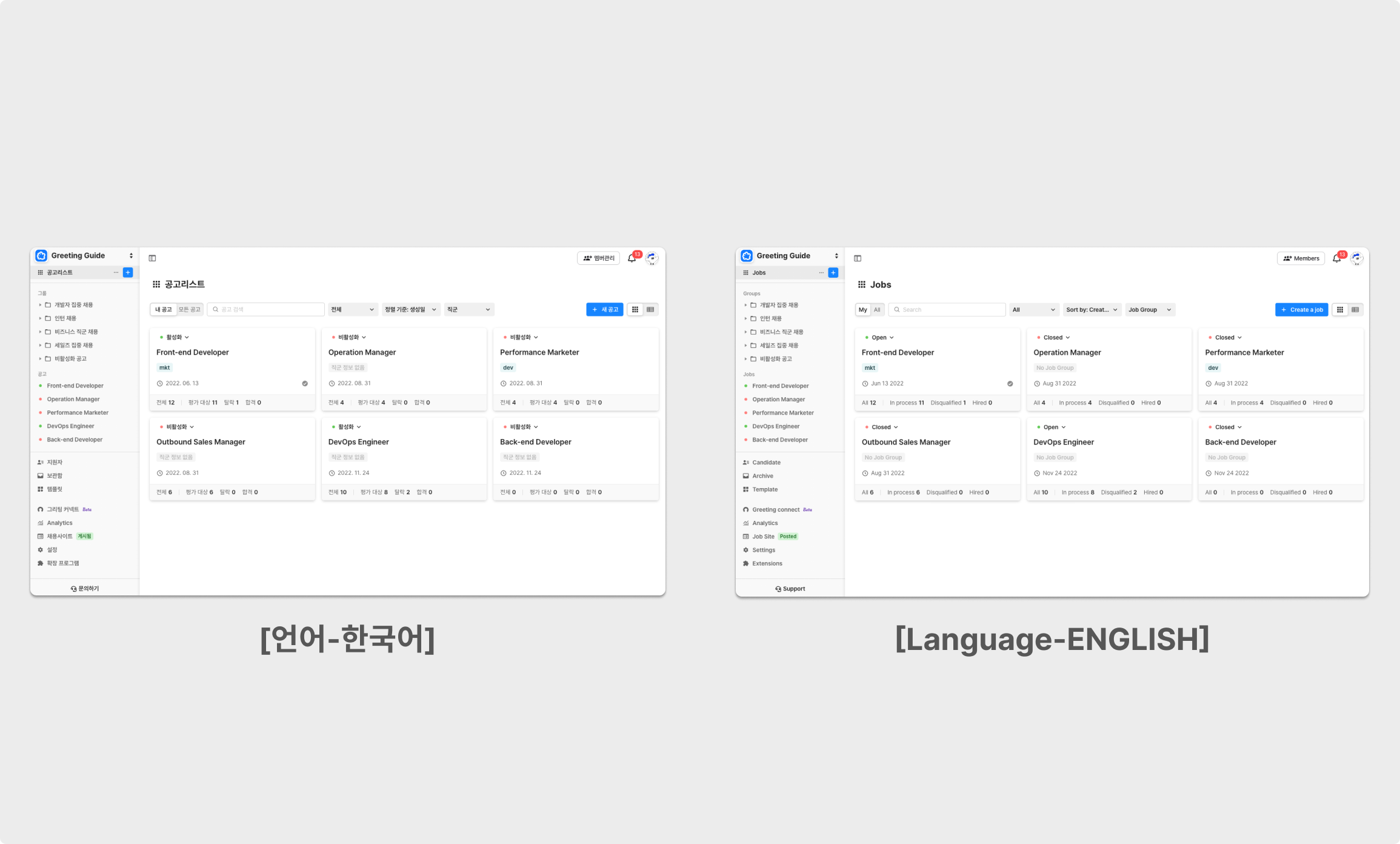 '우측 상단 프로필 버튼 → 내 계정 → 언어'를 통해 그리팅 시스템의 언어를 국문과 영문으로 설정할 수 있습니다.