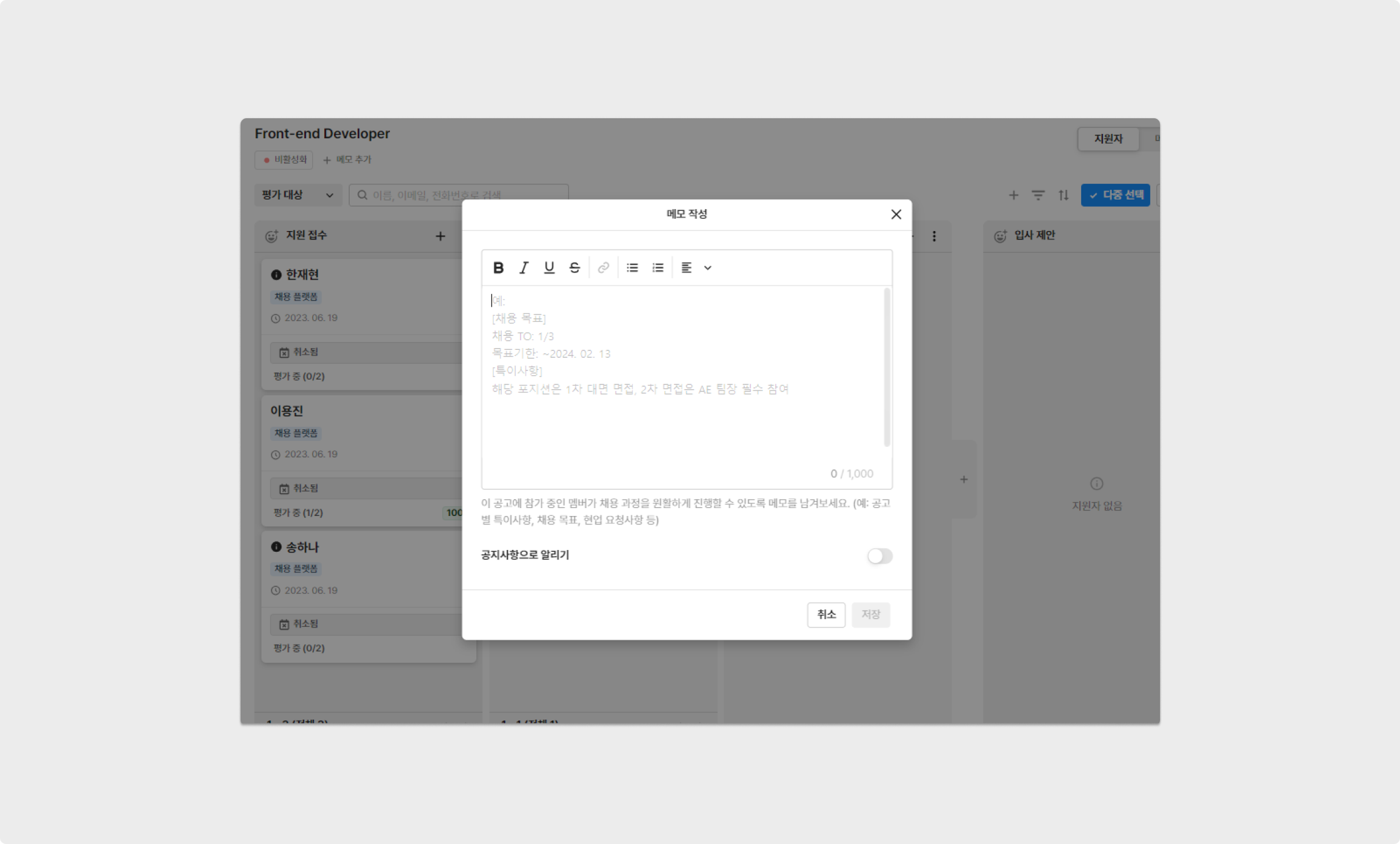 작성된 공고 메모는 공고를 참여한 모든 멤버가 확인할 수 있으며, 1000자 까지 작성할 수 있습니다.