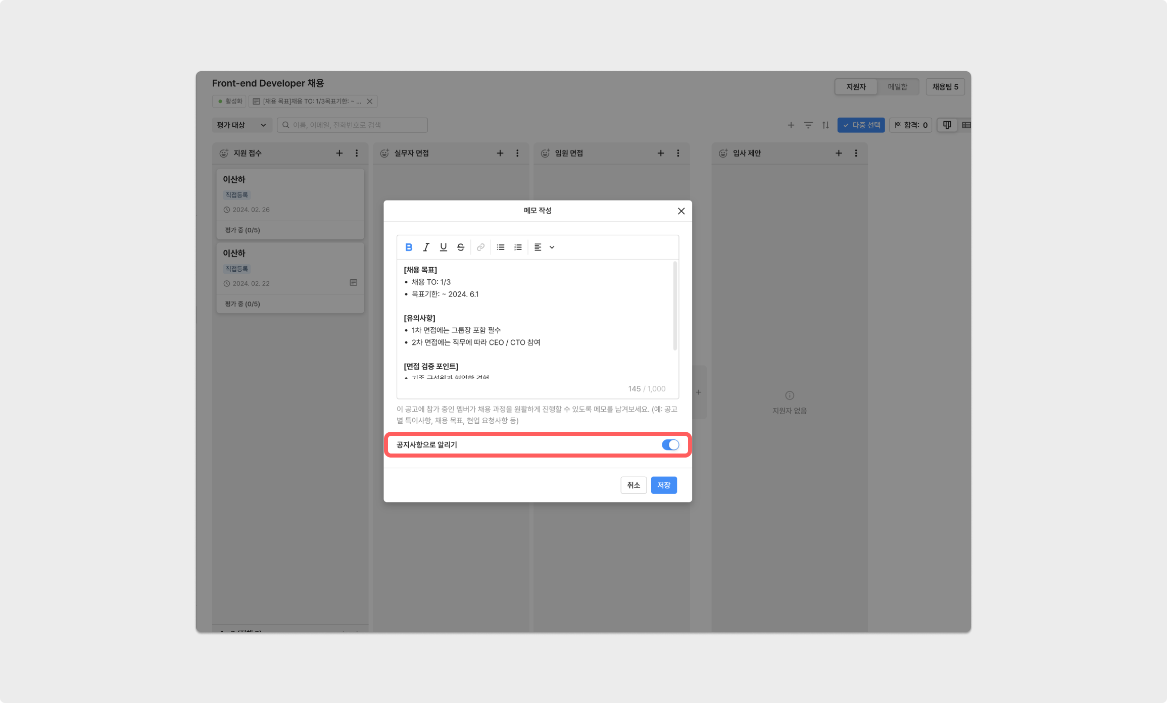 공고 메모는 공고에 참여한 공고 관리 권한을 가진 멤버가 설정할 수 있습니다.