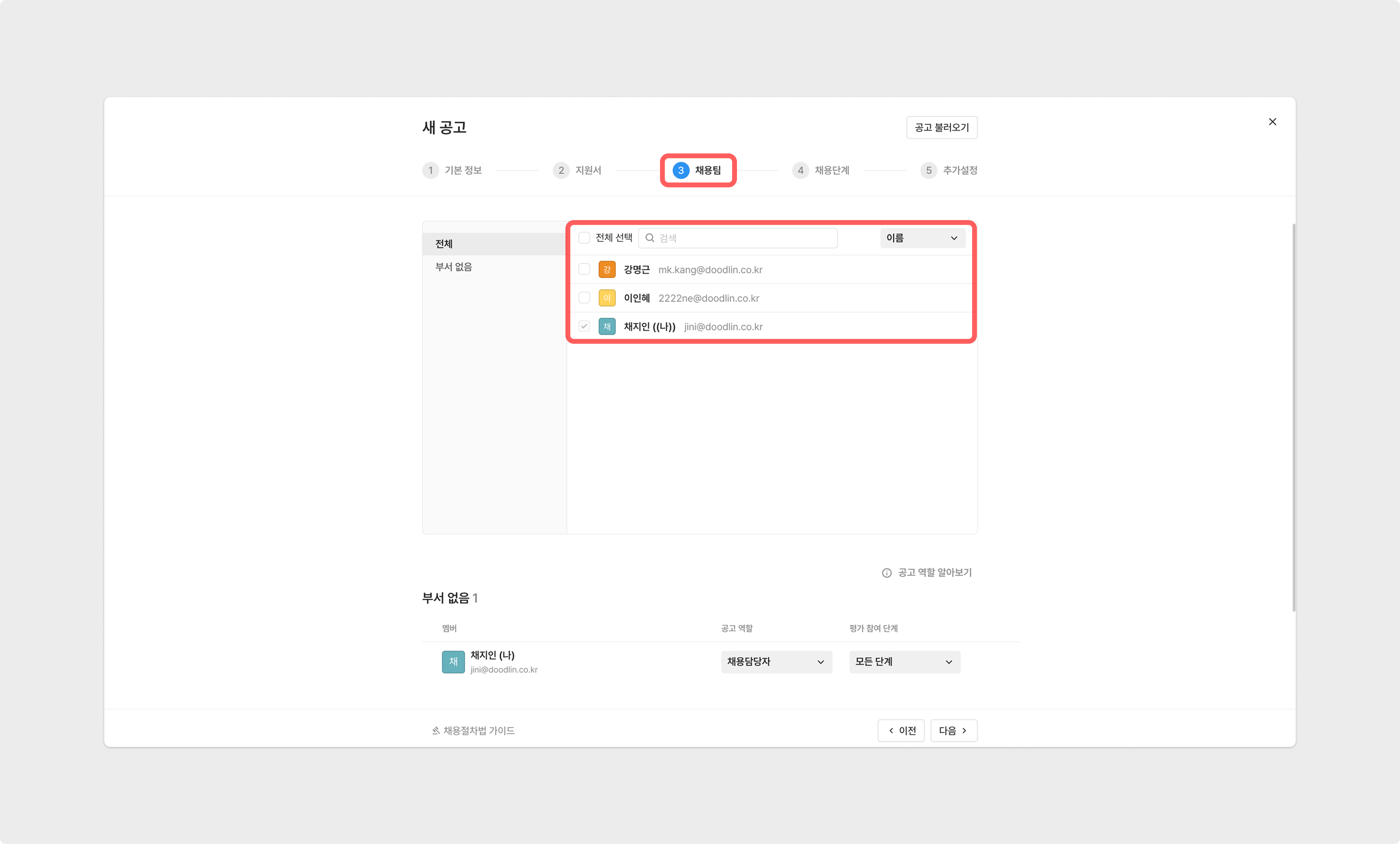 워크스페이스 멤버 중, 공고 합류가 필요한 멤버를 선택해 줍니다.