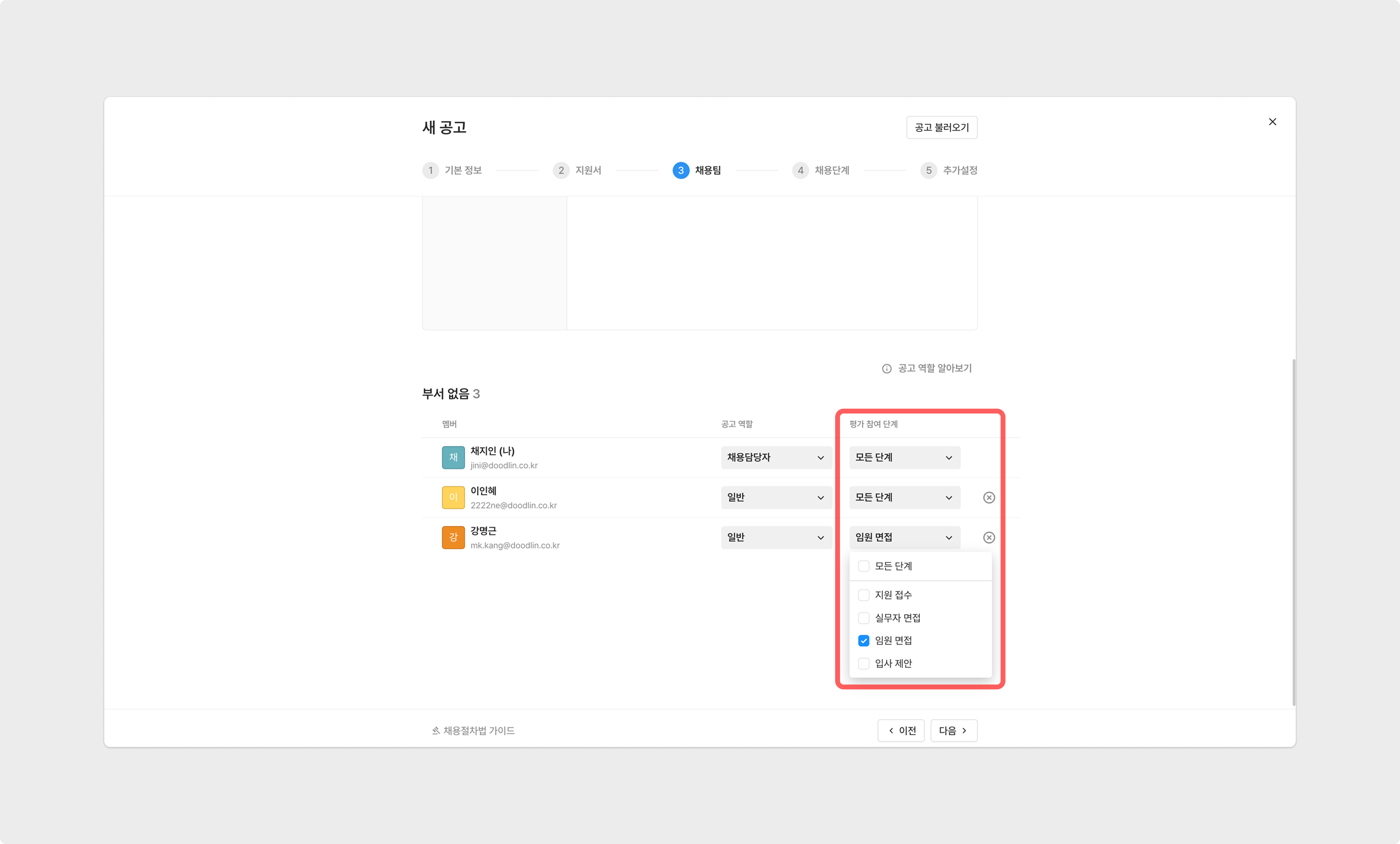 멤버가 공고에서 참여하게 될 평가 단계를 선택해 줍니다.