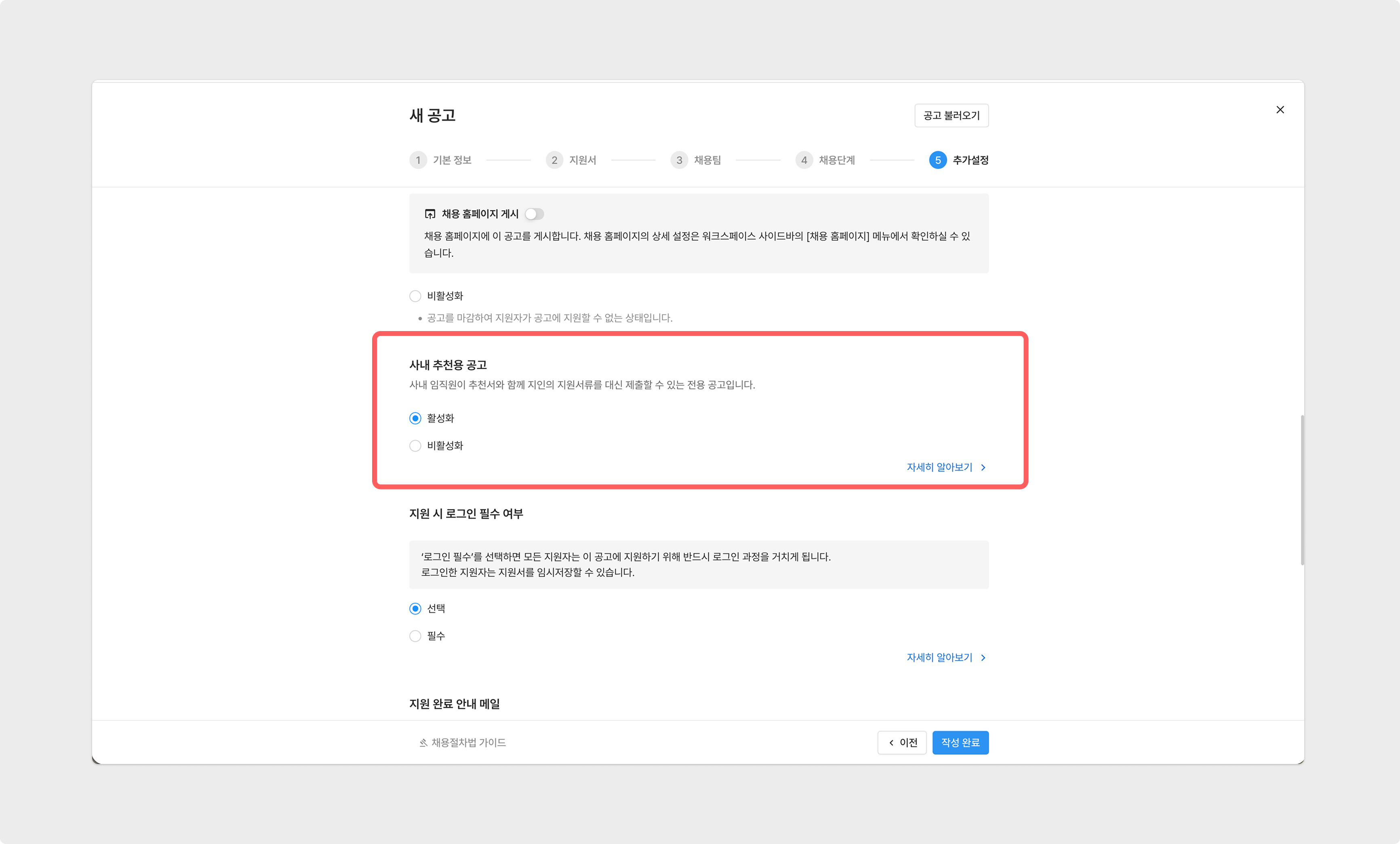 [공고 설정 → ❺ 추가설정 → 사내 추천용 공고]