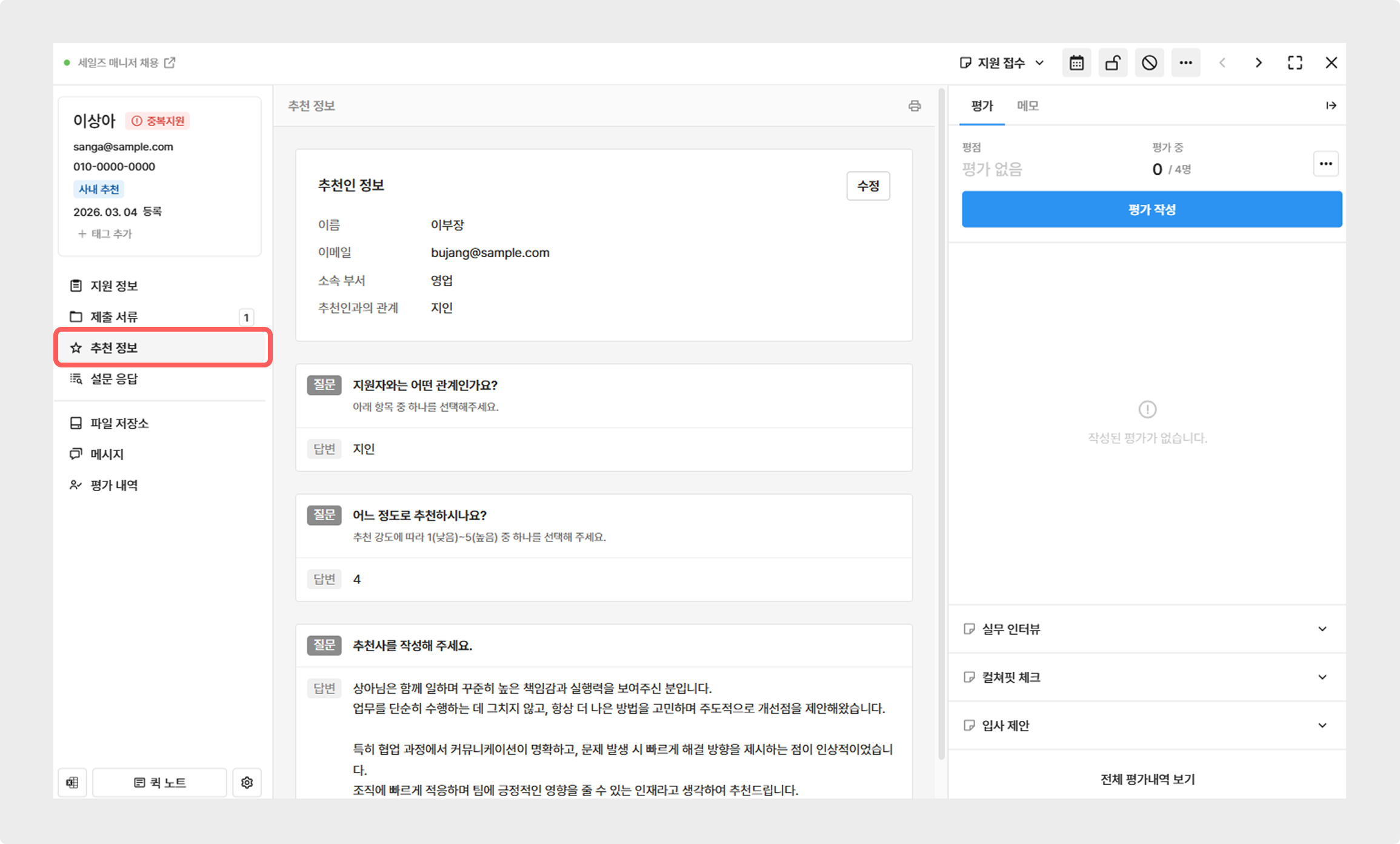 [지원자 페이지 → 추천 정보] 에서 추천인 및 추천서를 확인할 수 있습니다.