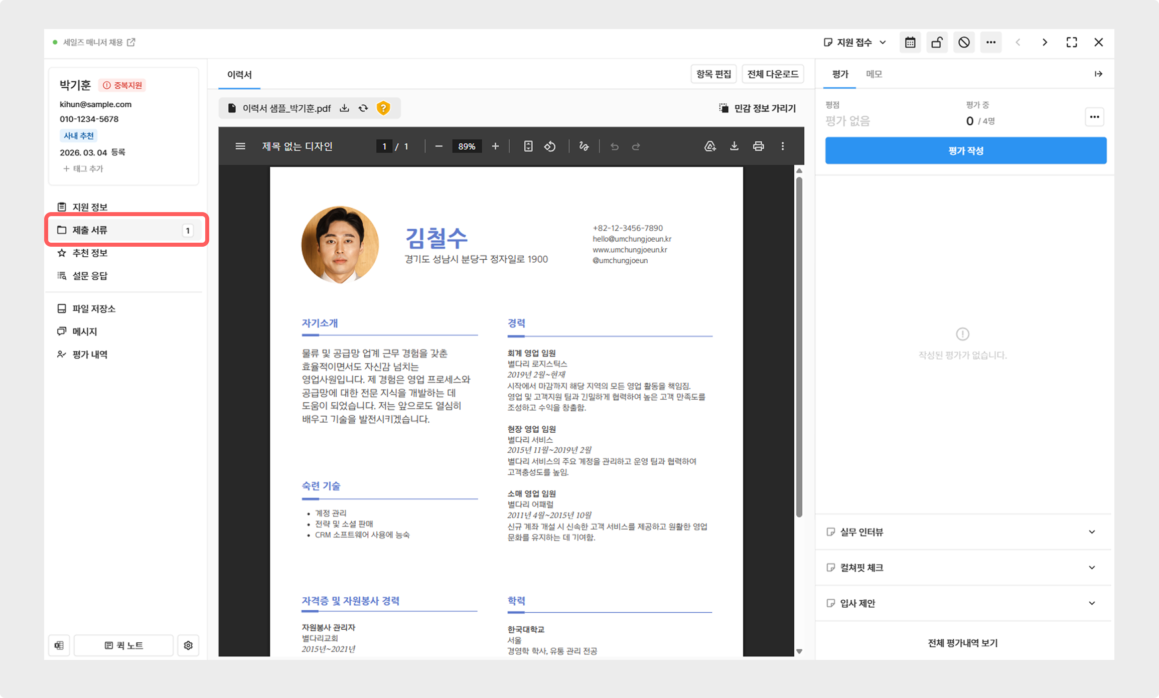 [지원자 페이지 → 제출서류] 에서 추천인이 제출한 지원자의 서류를 확인할 수 있습니다.