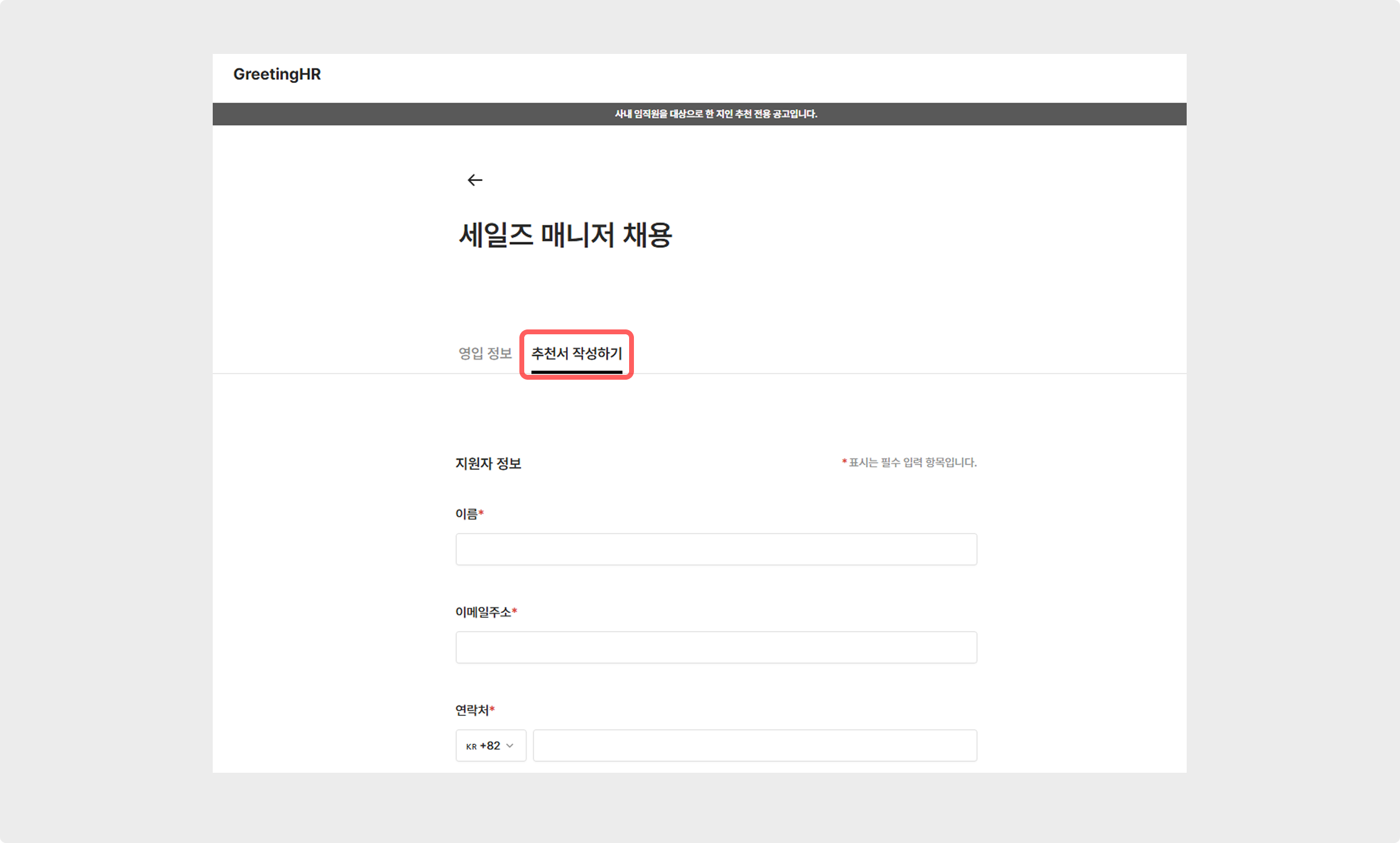 지원자가 직접 지원하면서, 추천인 정보만 기재하여 제출합니다.