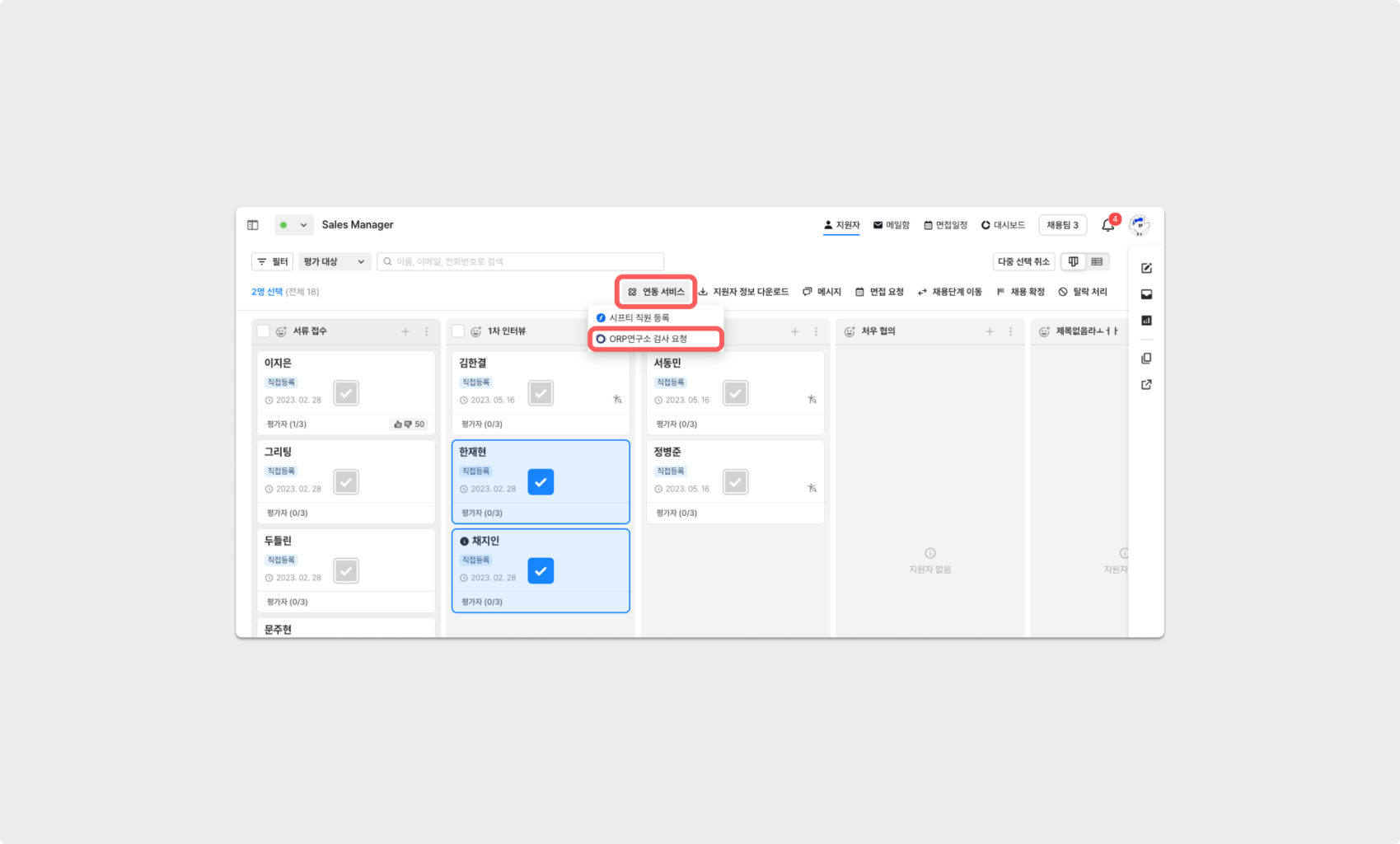 지원자 리스트 내 우측 상단의 다중 선택(파란색 버튼) → 지원자 다중 선택 → 연동 서비스 → ORP연구소 검사 요청 버튼 클릭